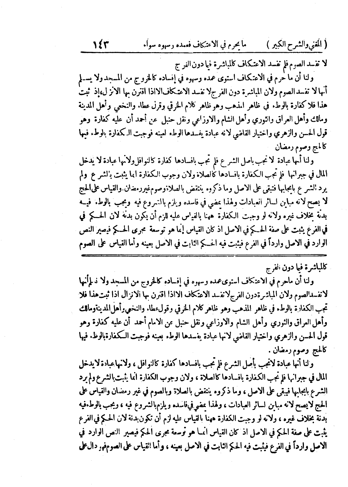 كالمباشرة فيما دون الفرج ولنا أن ما حرم في الاعتكاف استوى عمده وسهوه في إفساده كالخروج من المسجد ولا نعلم أنها لا تفسد الصوم ولأن المباشرة دون الفرج لا تفسد الاعتكاف إلا إذا اقترن بها الإنزال إذا ثبت هذا فلا تجب الكفارة بالوطئ في ظاهر المذهب وهو ظاهر كلام الخرقي وقول عطاء والنخعي وأهل المدينة ومالك وأهل العراق والثوري وأهل الشام والاوزاعي ونقل حنبل عن الإمام أحمد أن عليه كفارة وهو قول الحسن والزهري واختيار القاضي لأنها عبادة يفسدها الوطئ بعينه فوجبت الكفارة بالوطئ فيها كالحج وصوم رمضان ولنا أنها عبادة لا تجب بأصل الشرع فلم تجب بإفسادها كفارة كالنوافل، ولأنها عبادة لا يدخل المال في جبرانها فلم تجب الكفارة بافسادها كالصلاة، ولأن وجوب الكفارة إنما يثبت بالشرع ولم يرد الشرع بإيجابها فيبقى على الأصل، وما ذكروه ينتقض بالصلاة وبالصوم في غير رمضان والقياس على الحج لا يصح لأنه مباين لسائر العبادات، ولهذا يمضي في فاسده ويلزم بالشروع فيه، ويجب بالوطئ فيه بدنة بخلاف غيره، ولأنه لو وجبت الكفارة ههنا بالقياس عليه لزم أن تكون بدنة لأن الحكم في الفرع يثبت على صفة الحكم في الاصل إذ كان القياس إنما هو توسعه مجرى الحكم فيصير النص الوارد في الأصل واردا في الفرع فيثبت فيه الحكم الثابت في الأصل بعينه، وأما القياس على الصوم فهو دال على