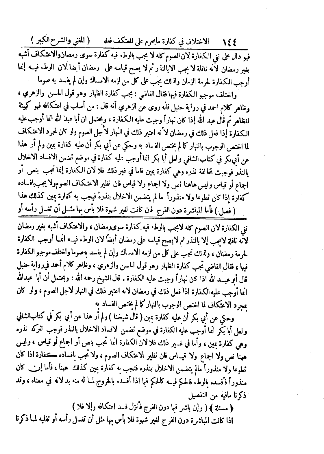 نفي الكفارة لأن الصوم كله لا يجب بالوطئ فيه كفارة سوى رمضان، والاعتكاف أشبه بغير رمضان لأنه نافلة لا يجب إلا بالنذر ثم لا يصح قياسه على رمضان أيضاً لان الوطئ فيه إنما أوجب الكفارة لحرمة رمضان، ولذلك تجب على كل من لزمه الإمساك وإن لم يفسد به صوماً واختلف موجبو الكفارة فيها، فقال القاضي تجب كفارة الظهار وهو قول الحسن والزهري، وظاهر كلام أحمد في رواية حنبل قال أبو عبد الله إذا كان نهاراً وجبت عليه الكفارة، قال الشيخ رحمه الله: ويحتمل أن أبا عبد الله إنما أوجب عليه الكفارة إذا فعل ذلك في رمضان لأنه اعتبر ذلك في النهار لأجل الصوم، ولو كان بمجرد الاعتكاف لما اختص الوجوب بالنهار كما لم يختص الفساد به وحكي عن أبي بكر أن عليه كفارة يمين (قال شيخنا) ولم أر هذا عن أبي بكر في كتاب الشافي ولعل أبا بكر إنما أوجب عليه الكفارة في موضع تضمن لافساد الإخلال بالنذر فوجب لتركه نذره وهي كفارة يمين، وأما في غير ذلك فلا لأن الكفارة إنما تجب بنص أو إجماع أو قياس، وليس ههنا نص ولا إجماع ولا قياس فإن نظير الاعتكاف الصوم، ولا تجب بإفساده كفارة إذا كان تطوعاً ولا منذوراً ما لم يتضمن الإخلال بنذره فتجب به كفارة يمين كذلك ههنا، فأما إن كان منذوراً فأفسده بالوطئ فالحكم فيه كالحكم فيما إذا أفسده بالخروج لما له منه بد لأنه في معناه، وقد ذكرنا ما فيه التفصيل (مسألة) (وإن باشر فيما دون الفرج فأنزل فسد اعتكافه وإلا فلا) إذا كانت المباشرة دون الفرج لغير شهوة فلا بأس بها مثل أن تغسل رأسه أو تفليه لما ذكرنا