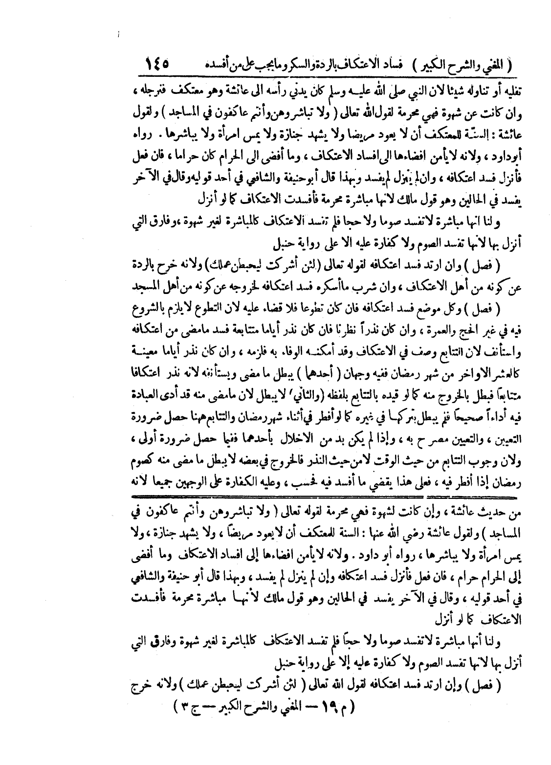 الاعتكاف كما لو أنزل ولنا أنها مباشرة لا يفسد صوماً ولا حجاً فلم تفسد الاعتكاف كالمباشرة لغير شهوة وفارق التي أنزل بها لأنها تفسد الصوم ولا كفارة عليه إلا على رواية حنبل (فصل) وإن ارتد فسد اعتكافه لقول الله تعالى (لئن أشركت ليحبطن عملك) ولأنه خرج