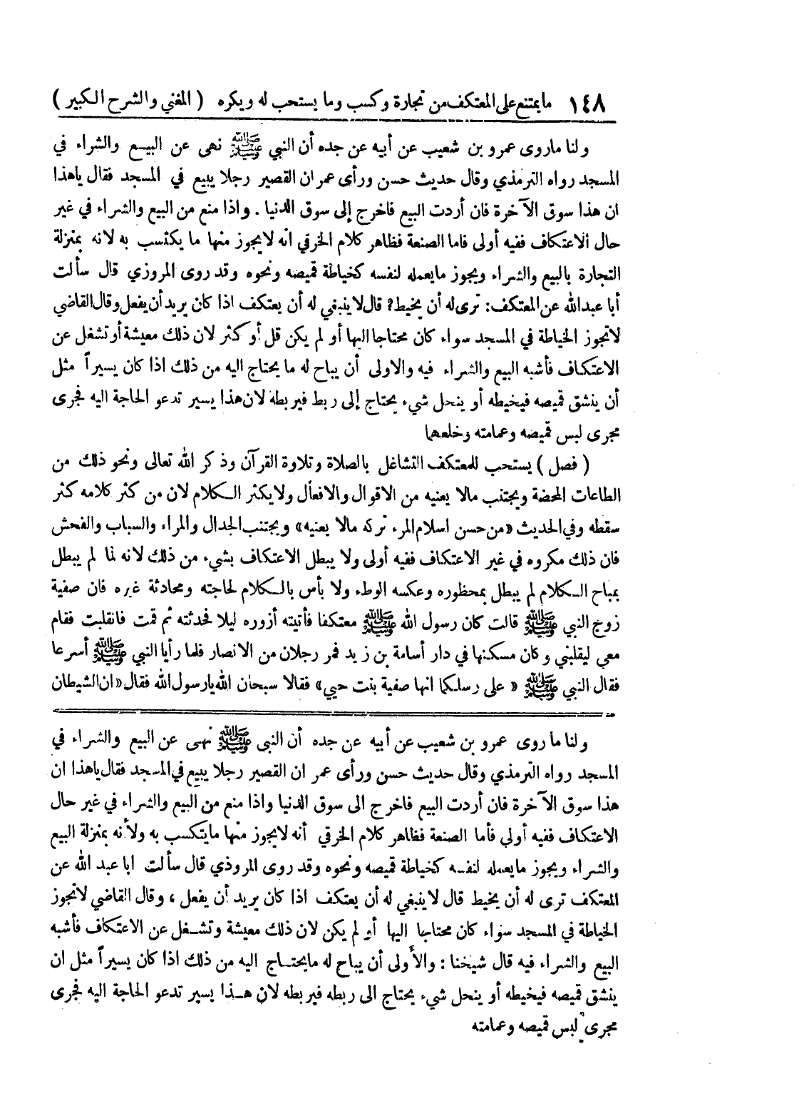 ولنا ماروى عمرو بن شعيب عن أبيه عن جده أن النبي صلى الله عليه وسلم نهى عن البيع والشراء في المسجد رواه الترمذي وقال حديث حسن ورأي عمر أن القصير رجلاً يبيع في المسجد فقال يا هذا إن هذا سوق الآخرة فإن أردت البيع فأخرج إلى سوق الدنيا وإذا منع من البيع والشراء في غير حال الاعتكاف ففيه أولى فأما الصنعة فظاهر كلام الخرقي أنه لا يجوز منها ما يتكسب به ولانه بمنزلة البيع والشراء ويجوز ما يعمله لنفسه كخياطة قميصه ونحوه وقد روى المروذي قال سألت أبا عبد الله عن المعتكف ترى له أن يخيط قال لا ينبغي له أن يعتكف إذا كان يريد أن يفعل، وقال القاضي لا تجوز الخياطة في المسجد سواء كان محتاجاً إليها أو لم يكن لأن ذلك معيشة وتشغل عن الاعتكاف فأشبه البيع والشراء فيه قال شيخنا: والأولى أن يباح له ما يحتاج إليه من ذلك إذا كان يسيراً مثل أن ينشق قميصه فيخيطه أو ينحل شئ يحتاج إلى ربطه فيربطه لأن هذا يسير تدعو الحاجة إليه فجرى مجرى لبس قميصه وعمامته