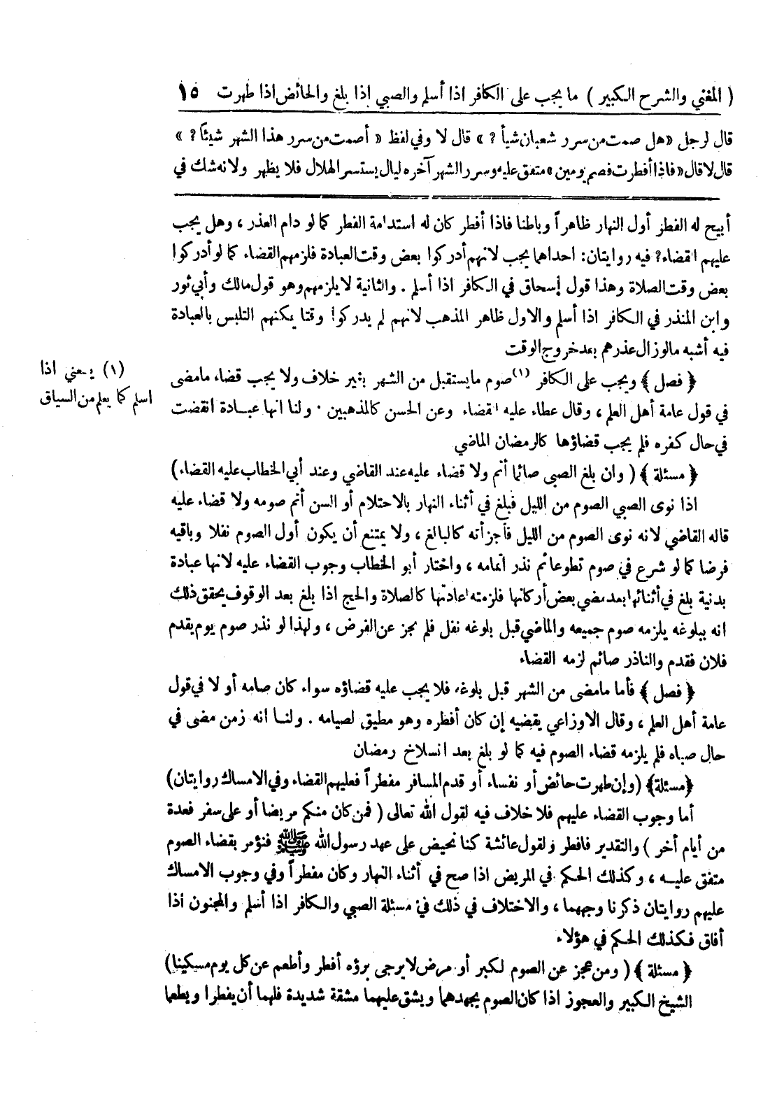 ولنا أنها عبادة انقضت في حال كفره فلم يجب قضاءها كالرمضان الماضي (مسألة) (وإن بلغ الصبي صائماً أتم ولا قضاء عليه عند القاضي وعند أبي الخطاب عليه القضاء) إذا نوى الصبي الصوم من الليل فبلغ في أثناء النهار بالاحتلام أو السن أتم صومه ولا قضاء عليه قاله القاضي لأنه نوى الصوم من الليل فأجزأته كالبالغ، ولا يمتنع أن يكون أول الصوم نفلاً وباقيه فرضاً كما لو شرع في صوم تطوعاً ثم نذر إتمامه، واختار أبو الخطاب وجوب القضاء عليه لأنها عبادة بدنية بلغ في أثنائها بعد مضي بعض أركانها فلزمته إعادتها كالصلاة والحج إذا بلغ بعد الوقوف يحقق ذلك أنه ببلوغه يلزمه صومه جميعه والماضي قبل بلوغه نفل فلم يجز عن الفرض، ولهذا لو نذر صوم يوم يقدم فلان فقدم والناذر صائم لزمه القضاء (فصل) فأما ما مضى من الشهر قبل بلوغه فلا يجب عليه قضاؤه سواء كان صامه أو لا في قول عامة أهل العلم، وقال الأوزاعي يقضيه إن كان أفطره وهو مطيق لصيامه، ولنا أنه زمن مضى في حال صباه فلم يلزمه قضاء الصوم فيه كما لو بلغ بعد انسلاخ رمضان (مسألة) (وإن طهرت حائض أو نفساء أو قدم مسافر مفطرا فعليهم الفضاء وفي الإمساك روايتان) أما وجوب القضاء عليهم فلا خلاف فيه لقوله تعالى (فمن كان منكم مريضا أو على سفر فعدة من أيام أخر) والتقدير فافطر ولقول عائشة كنا نحيض على عهد رسول الله (ص) فنؤمر بقضاء الصوم متفق عليه، وكذلك الحكم في المريض إذا صح في أثناء النهار وكان مفطراً وفي وجوب الإمساك عليهم روايتان ذكرنا وجههما، والاختلاف في ذلك في مسألة الصبي والكافر إذا أسلم والمجنون إذا أفاق فكذلك الحكم في هؤلاء (مسألة) (ومن عجز عن الصوم لكبر أو مرض لا يرجى برؤه أفطر وأطعم عن كل يوم مسكيناً) الشيخ الكبير والعجوز إذا كان الصوم يجهدهما ويشق عليهما مشقة شديدة فلهما أن يفطرا ويطعما