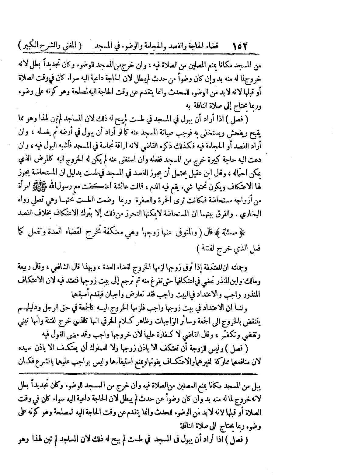 يبل من المسجد مكاناً يمنع المصلين من الصلاة فيه وإن خرج من المسجد للوضوء وكان تجديداً بطل لأنه خروج لما له منه بد وإن كان وضوأ عن حدث لم يبطل لأن الحاجة داعية إليه سواء كان في وقت الصلاة أو قبلها لأنه لا بد من الوضوء للحدث وإنما يتقدم عن وقت الحاجة إليه لمصلحة وهو كونه على وضوء ربما يحتاج إلى صلاة النافلة (فصل) إذا أراد أن يبول في المسجد في طست لم يبح له ذلك لأن المساجد لم تبن لهذا وهو