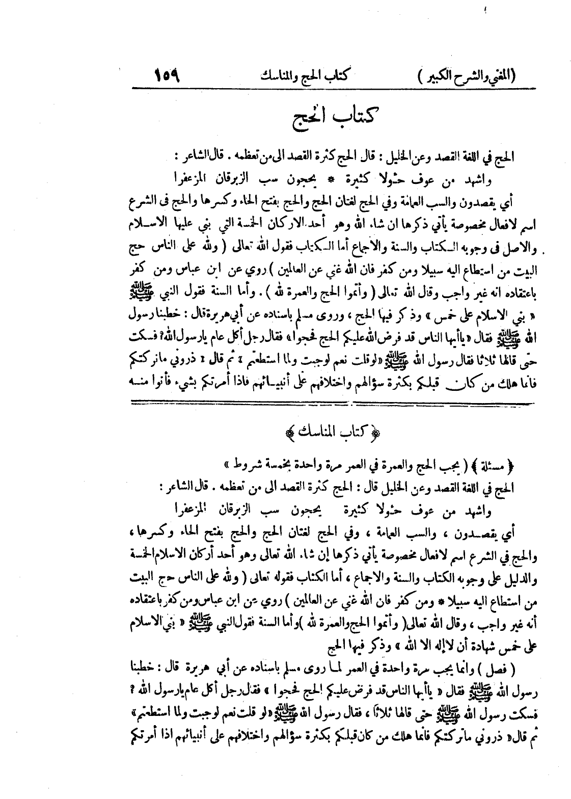 قال الشاعر: واشهد من عوف حئولا كثيرة * يحجون سب الزبرقان المزعفرا أي يقصدون، والسب العمامة، وفي الحج لغتان الحج والحج بفتح الحاء وكسرها، والحج في الشرع اسم لأفعال مخصوصة يأتي ذكرها إن شاء الله تعالى وهو أحد أركان الإسلام الخمسة والدليل على وجوبه الكتاب والسنة والإجماع، أما الكتاب فقوله تعالى (ولله على الناس حج البيت من استطاع إليه سبيلا * ومن كفر فإن الله غني عن العالمين) روي عن ابن عباس ومن كفر باعتقاده أنه غير واجب، وقال الله تعالى (وأتموا الحج والعمرة لله) وأما السنة فقول النبي صلى الله عليه وسلم " بنى الإسلام على خمس شهادة ان لا إله إلا الله " وذكر فيها الحج (فصل) وإنما يجب مرة واحدة في العمر لما روى مسلم بإسناده عن أبي هريرة قال: خطبنا رسول الله صلى الله عليه وسلم فقال " يا أيها الناس قد فرض عليكم الحج فحجوا " فقال رجل أكل عام يارسول الله؟