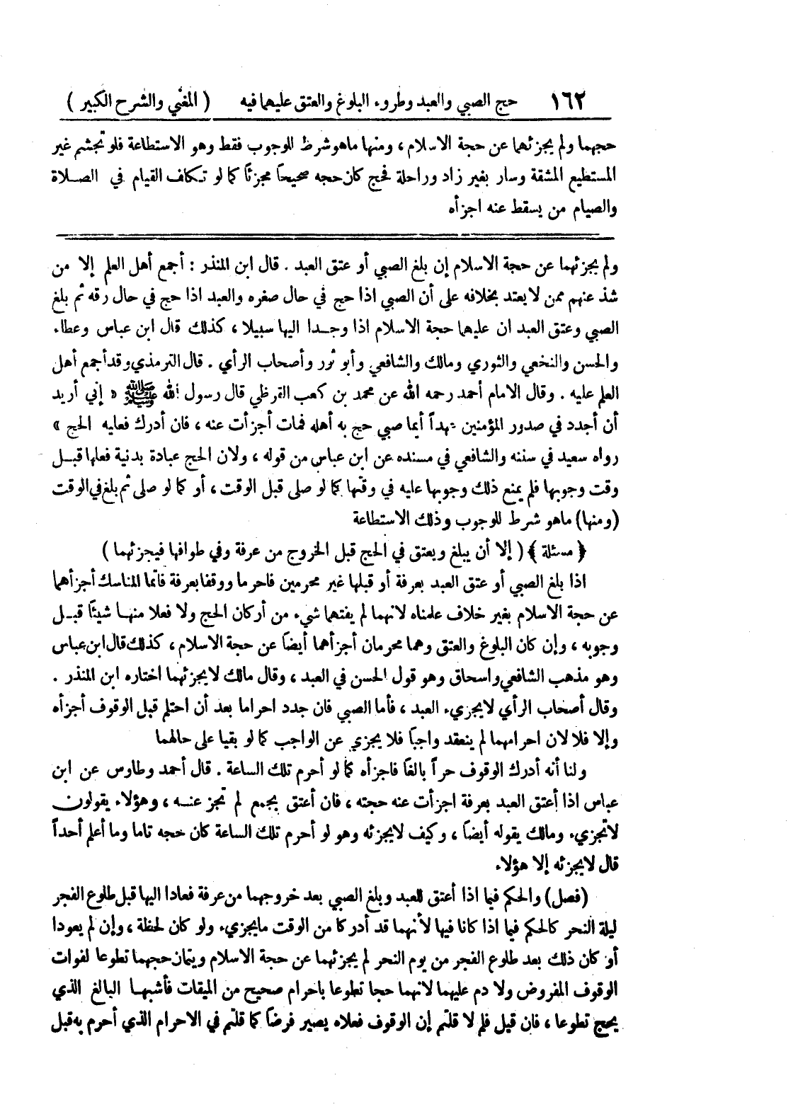 وقال أصحاب الرأي لا يجزئ العبد، فأما الصبي فإن جدد إحراماً بعد أن أحتلم قبل الوقوف أجزأه وإلا فلا لأن إحرامهما لم ينعقد واجباً فلا يجزي عن الواجب كما لو بقيا على حالهما ولنا أنه أدرك الوقوف حراً بالغاً فأجزأه كما لو احرم تلك الساعة، قال أحمد وطاوس عن ابن عباس إذا أعتق العبد بعرفة اجزأت عنه حجته، فإن أعتق بجمع لم تجز عنه، وهؤلاء يقولون لاتجزئ ومالك يقوله أيضاً، وكيف لا يجزئه وهو لو أحرم تلك الساعة كان حجة تاماً وما أعلم أحداً قال لا يجزئه إلا هؤلاء