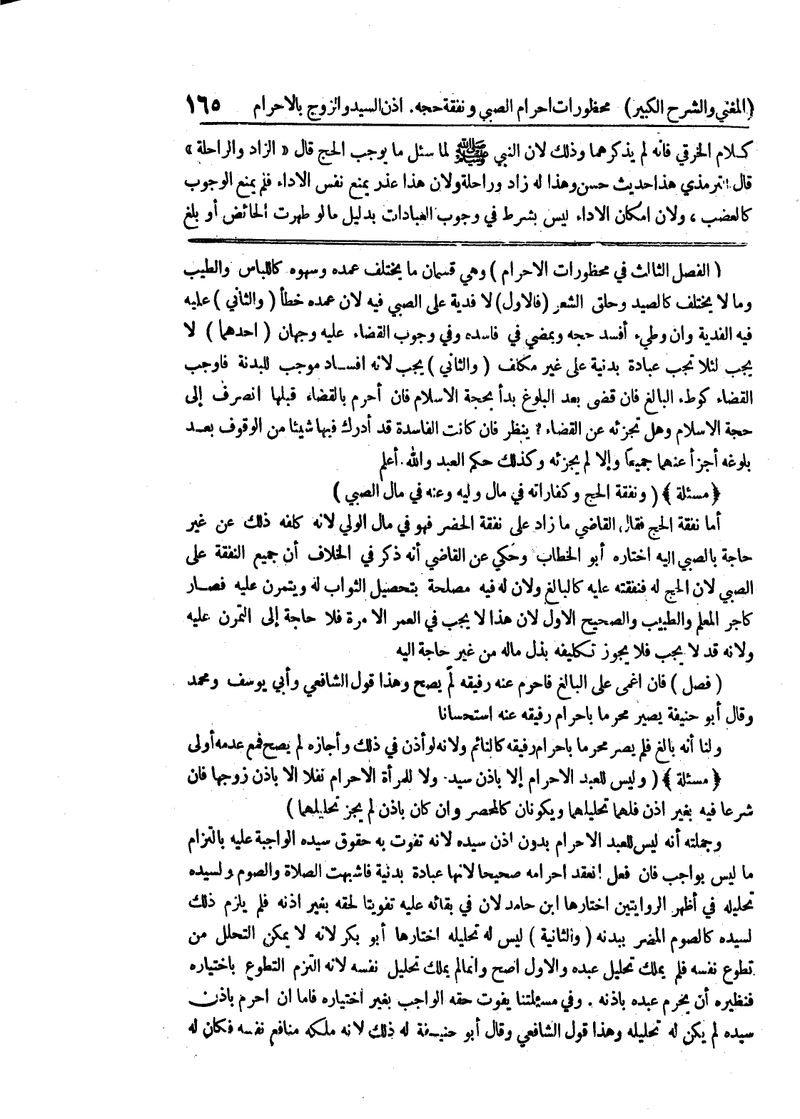 أما نفقة الحج فقال القاضي ما زاد على نفقة الحضر فهو في مال الولي لأنه كلفه ذلك عن غير حاجة بالصبي إليه اختاره أبو الخطاب وحكي عن القاضي أنه ذكر في الخلاف أن جميع النفقة على الصبي لأن الحج له فنفقته عليه كالبالغ ولأن له فيه مصلحة بتحصيل الثواب له ويتمرن عليه فصار كأجر المعلم والطبيب والصحيح الأول لأن هذا لا يجب في العمر إلا مرة فلا حاجة الى التمرن عليه ولأنه قد لا يجب فلا يجوز تكليفه بذل ماله من غير حاجة إليه (فصل) فإن أغمي على البالغ فأحرم عنه رفيقه لم يصح وهذا قول الشافعي وأبي يوسف ومحمد وقال أبو حنيفة يصير محرماً بإحرام رفيقه عنه استحساناً ولنا أنه بالغ فلم يصر محرماً بإحرام رفيقه كالنائم ولأنه لو أذن في ذلك وأجازه لم يصح فمع عدمه أولى (مسألة) (وليس للعبد الإحرام إلا بإذن سيد ولا للمرأة الإحرام نفلاً إلا بإذن زوجها فإن شرعا فيه بغير إذن فلهما تحليلهما ويكونان كالمحصر وإن كان بإذن لم يجز تحليلهما) وجملته أنه ليس للعبد الإحرام بدون إذن سيده لأنه تفوت به حقوق سيده الواجبة عليه بالتزام ما ليس بواجب فإن فعل انعقد إحرامه صحيحاً لأنها عبادة بدنية فأشبهت الصلاة والصوم ولسيده تحليله في أظهر الروايتين اختارها ابن حامد لأن في بقائه عليه تفويتاً لحقه بغير إذنه فلم يلزم ذلك لسيده كالصوم المضر ببدنه (والثانية) ليس له تحليله اختارها أبو بكر لأنه لا يمكن التحلل من تطوع نفسه فلم يملك تحليل عبده والأول أصح وإنما لم يملك تحليل نفسه لأنه التزم التطوع باختياره فنظيره أن يحرم عبده بإذنه، وفي مسئلتنا يفوت حقه الواجب بغير اختياره فأما إن أحرم بإذن سيده لم يكن له تحليله وهذا قول الشافعي وقال أبو حنيفة له ذلك لأنه ملكه منافع نفسه فكان له