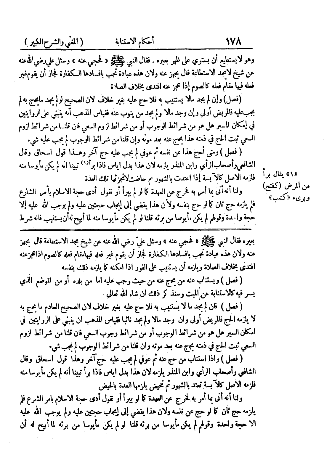 بعيره فقال النبي صلى الله عليه وسلم " فحجي عنه " وسئل علي رضي الله عنه عن شيخ يجد الاستطاعة قال يجهز عنه ولأن هذه عبادة تجب بإفسادها الكفارة فجاز أن يقوم غير فعله فيها مقام فعله كالصوم إذا عجز عنه افتدى بخلاف الصلاة ويلزمه أن يستنيب على الفور إذا أمكنه كما يلزمه ذلك بنفسه (فصل) ويستناب عنه من يحج عنه من حيث وجب عليه إما من بلده أو من الموضع الذي يسر فيه كالاستنابة عن الميت وسنذكر ذلك إن شاء الله تعالى (فصل) فإن لم يجد مالاً يستنيب به فلا حج عليه بغير خلاف لأن الصحيح العادم ما يحج به لا يلزمه الحج فالمريض أولى وإن وجد مالا ولم يجد نائباً فقياس المذهب أن ينبني على الروايتين في امكان السير هل هو من شرائط الوجوب أو من شرائط وجوب السعي فإن قلنا من شرائط لزوم