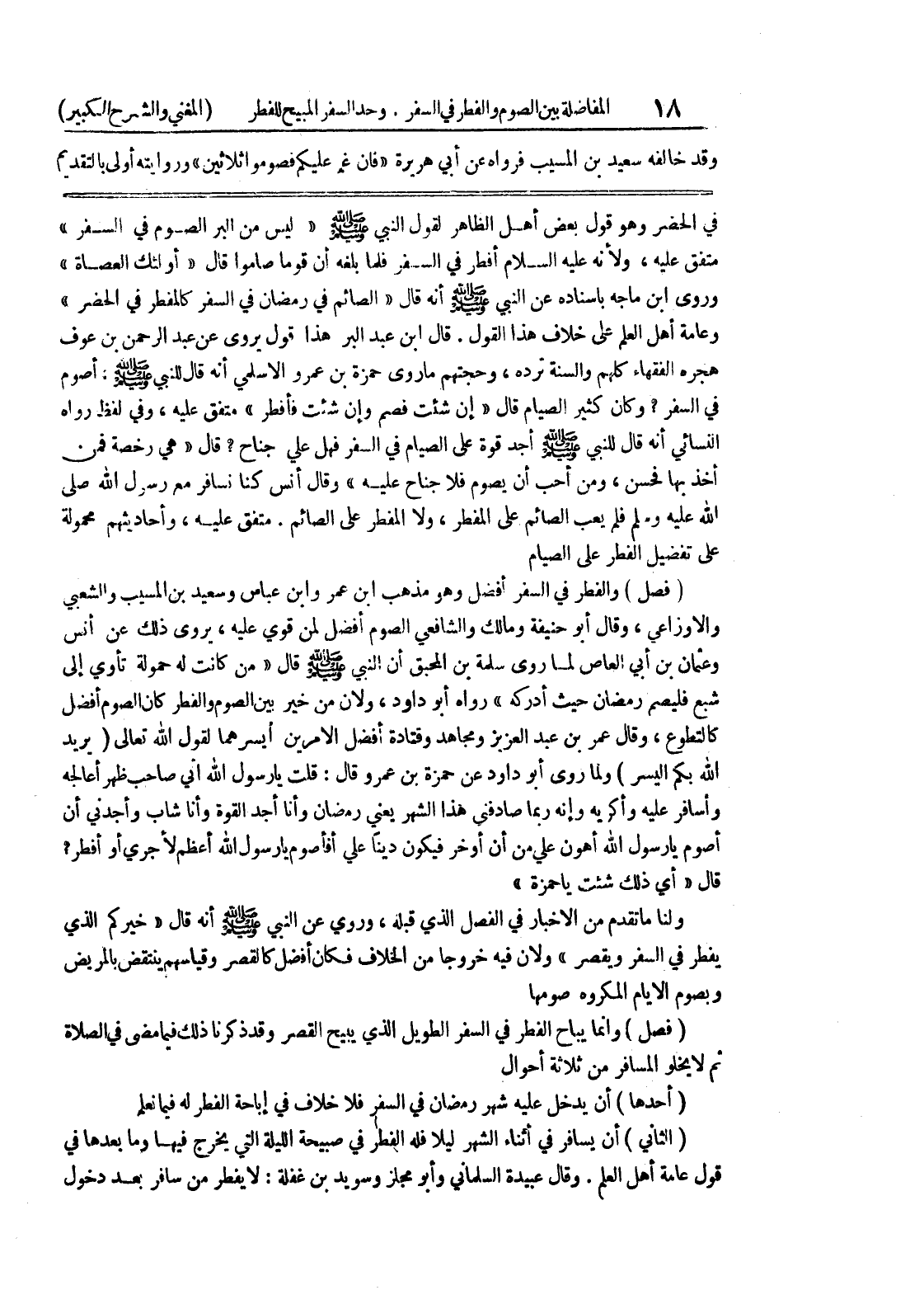 وعثمان بن أبي العاص لما روى سلمة بن المحبق أن النبي صلى الله عليه وسلم قال " من كانت له حمولة تأوي إلى شبع فليصم رمضان حيث أدركه " رواه أبو داود، ولأن من خير بين الصوم والفطر كان الصوم أفضل كالتطوع، وقال عمر بن عبد العزيز ومجاهد وقتادة أفضل الأمرين أيسرهما لقول الله تعالى " يريد الله بكم اليسر " ولما روى أبودواد عن حمزة بن عمرو قال: قلت يا رسول الله إني صاحب ظهر أعالجه وأسافر عليه وأكريه وإنه ربما صادفني هذا الشهر يعني رمضان وأنا أجد القوة وأنا شاب وأجدني أن أصوم يا رسول الله أهون علي من أن أوخر فيكون ديناً علي أفأصوم يارسول الله أعظم لأجري أو أفطر؟ قال " أي ذلك شئت يا حمزة " ولنا ما تقدم من الأخبار في الفصل الذي قبله، وروي عن النبي صلى الله عليه وسلم أنه قال " خيركم الذي يفطر في السفر ويقصر " ولأن فيه خروجاً من الخلاف فكان أفضل كالقصر وقياسهم ينتفض بالمريض وبصوم الأيام المكروه صومها (فصل) وإنما يباح الفطر في السفر الطويل الذي يبيح القصر وقد ذكرنا ذلك فيما مضى في الصلاة ثم لا يخلو المسافر من ثلاث أحوال (أحدها) أن يدخل عليه شهر رمضان في السفر فلا خلاف في إباحة الفطر له فيما نعلم (الثاني) أن يسافر في أثناء الشهر ليلاً فله الفطر في صبيحة الليلة التي يخرج فيها وما بعدها في قول عامة أهل العلم، وقال عبيدة السلماني وأبو مجاز وسويد بن غفلة: لا يفطر من سافر بعد دخول