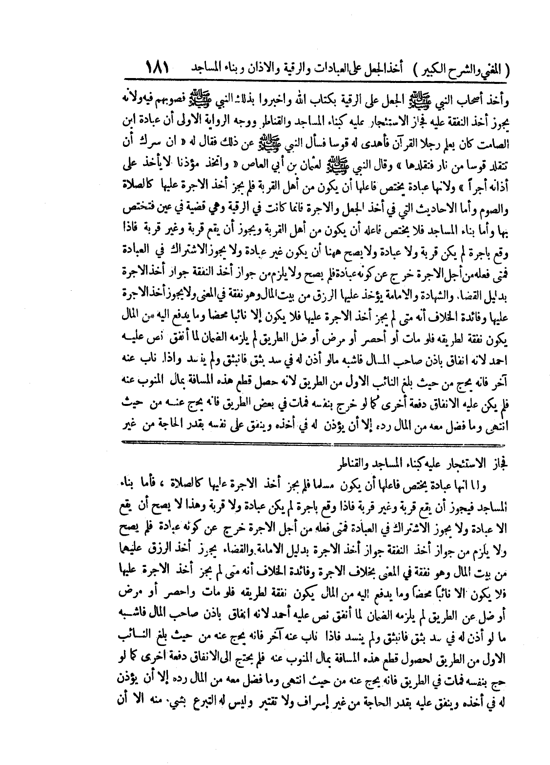 فجاز الاستئجار عليه كبناء المساجد والقناطر ولما أنها عبادة يختص فاعلها أن يكون مسلماً فلم يجز أخذ الأجرة عليها كالصلاة، فأما بناء المساجد فيجوز أن يقع قربه وغير قربة فإذا وقع بأجرة لم يكن عبادة ولا قربة وهذا لا يصح أن يقع إلا عبادة ولا يجوز الاشتراك في العبادة فمتى فعله من أجل الأجرة خرج عن كونه عبادة فلم يصح ولا يلزم من جواز أخذ النفقة جواز أخذ الأجرة بدليل الإمامة والقضاء يجوز أخذ الرزق عليهما من بيت المال وهو نفقة في المعنى بخلاف الأجرة وفائدة الخلاف أنه متى لم يجز أخذ الأجرة عليها فلا يكون الا نائباً محضاً وما يدفع إليه من المال يكون نفقة لطريقه فلو مات وأحصر أو مرض أو ضل الطريق لم يلزمه الضمان لما أنفق نص عليه أحمد لأنه إنفاق بإذن صاحب المال فأشبه ما لو أذن له في سد بثق فانبثق ولم ينسد فإذا ناب عنه آخر فإنه يحج عنه من حيث بلغ النائب الأول من الطريق لحصول قطع هذه المسأفة بمال المنوب عنه فلم يحتج إلى الانفاق دفعة أخرى كما لو حج بنفسه فمات في الطريق فإنه يحج عنه من حيث انتهى وما فضل معه من المال رده إلا أن يؤذن له في أخذه وينفق عليه بقدر الحاجة من غير إسراف ولا تقتير وليس له التبرع بشئ منه إلا أن