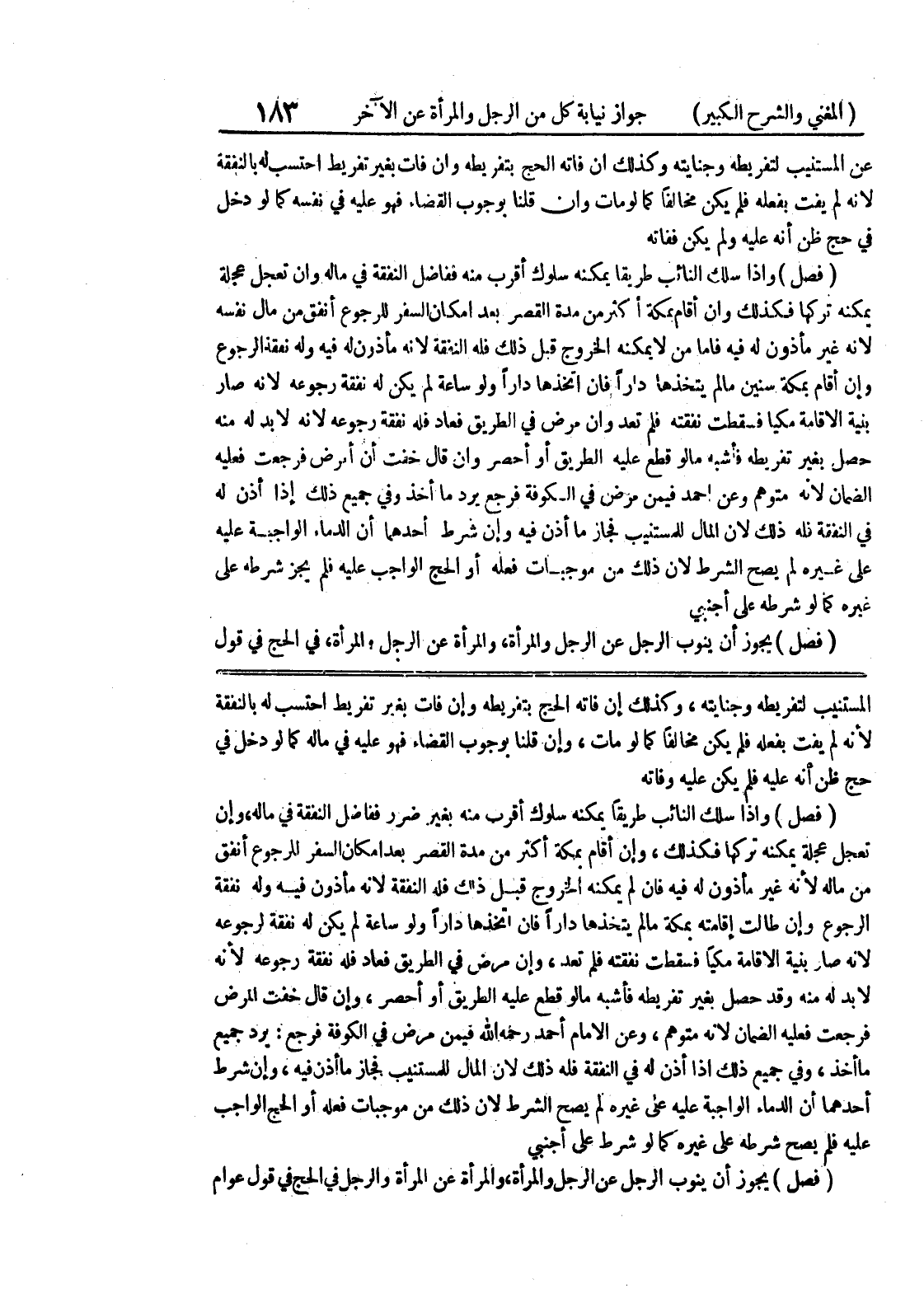 فرجعت فعليه الضمان لأنه متوهم، وعن الإمام أحمد رحمه الله فيمن مرض في الكوفة فرجع: يرد جميع ما أخذ، وفي جميع ذلك إذا أذن له في النفقة فله ذلك لأن المال للمستنيب فجاز ما أذن فيه، وإن شرط أحدهما أن الدماء الواجبة عليه على غيره لم يصح الشرط لأن ذلك من موجبات فعله أو الحج الواجب عليه فلم يصح شرطه على غيره كما لو شرط على أجنبي (فصل) يجوز أن ينوب الرجل عن الرجل والمرأة، والمرأة عن المرأة والرجل في الحج في قول عوام