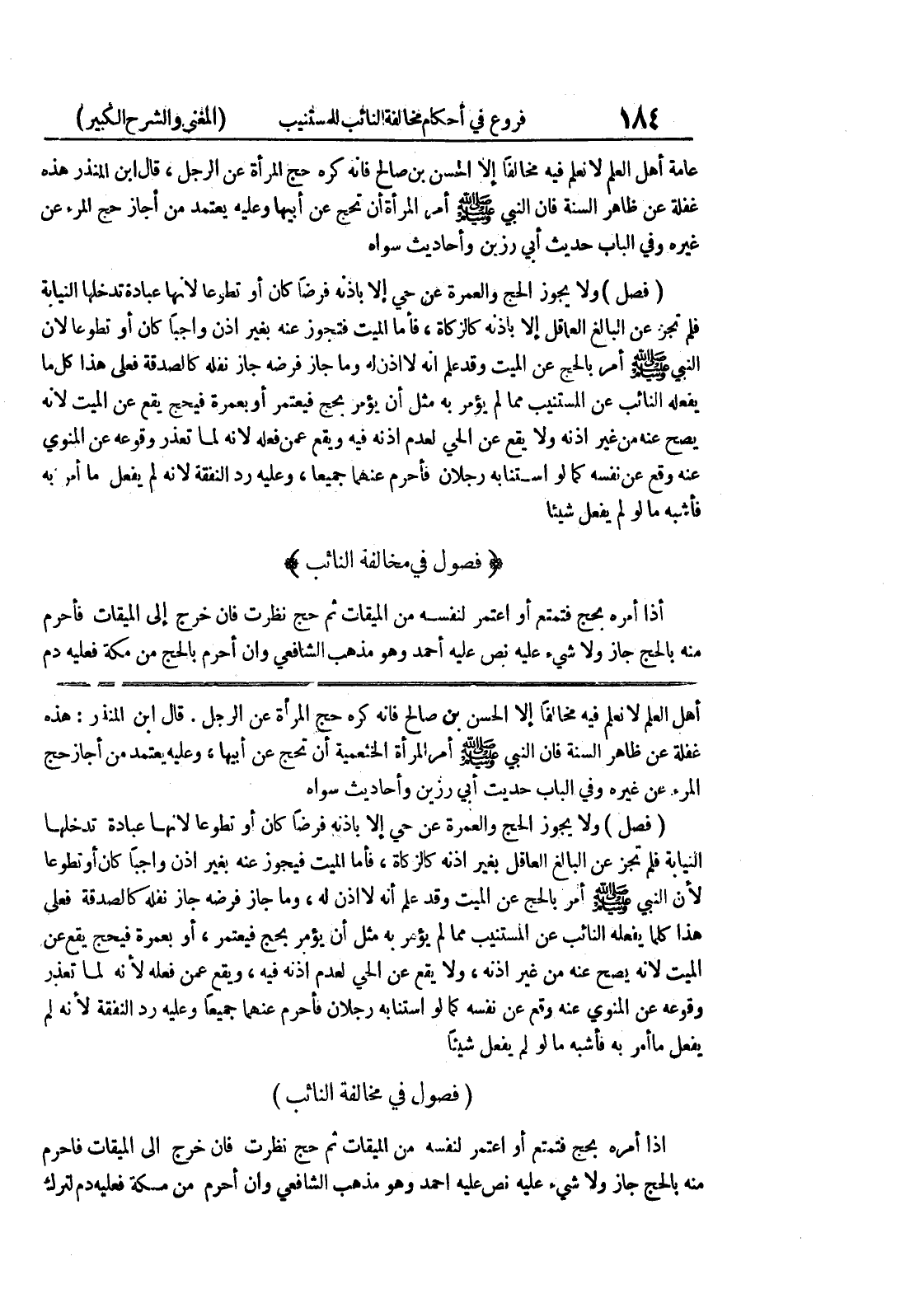 قال إبن المنذر: هذه غفلة عن ظاهر السنة فإن النبي صلى الله عليه وسلم أمر المرأة الخثعمية أن تحج عن أبيها، وعليه يعتمد من أجاز حج المرء عن غيره وفي الباب حديث أبي رزين وأحاديث سواه (فصل) ولا يجوز الحج والعمرة عن حي إلا بإذنه فرضاً كان أو تطوعاً لأنها عبادة تدخلها النيابة فلم تجز عن البالغ العاقل بغير إذنه كالزكاة، فأما الميت فيجوز عنه بغير إذن واجباً كان أو تطوعاً لأن النبي صلى الله عليه وسلم أمر بالحج عن الميت وقد علم أنه لااذن له، وما جاز فرضه جاز نفله كالصدقة فعلى هذا كلما يفعله النائب عن المستنيب مما لم يؤمر به مثل أن يؤمر بحج فيعتمر، أو بعمرة فيحج يقع عن الميت لأنه يصح عنه من غير إذنه، ولا يقع عن الحي لعدم إذنه فيه، ويقع عمن فعله لأنه لما تعذر وقوعه عن المنوي عنه وقع عن نفسه كما لو استنابه رجلان فأحرم عنهما جميعا وعليه رد النفقة لأنه لم يفعل ما أمر به فأشبه ما لو لم يفعل شيئاً (فصول في مخالفة النائب) إذا أمره بحج فتمتع أو اعتمر لنفسه من الميقات ثم حج نظرت فإن خرج إلى الميقات فأحرم منه بالحج جاز ولا شئ عليه نص عليه أحمد وهو مذهب الشافعي وإن أحرم من مكة فعليه دم لترك