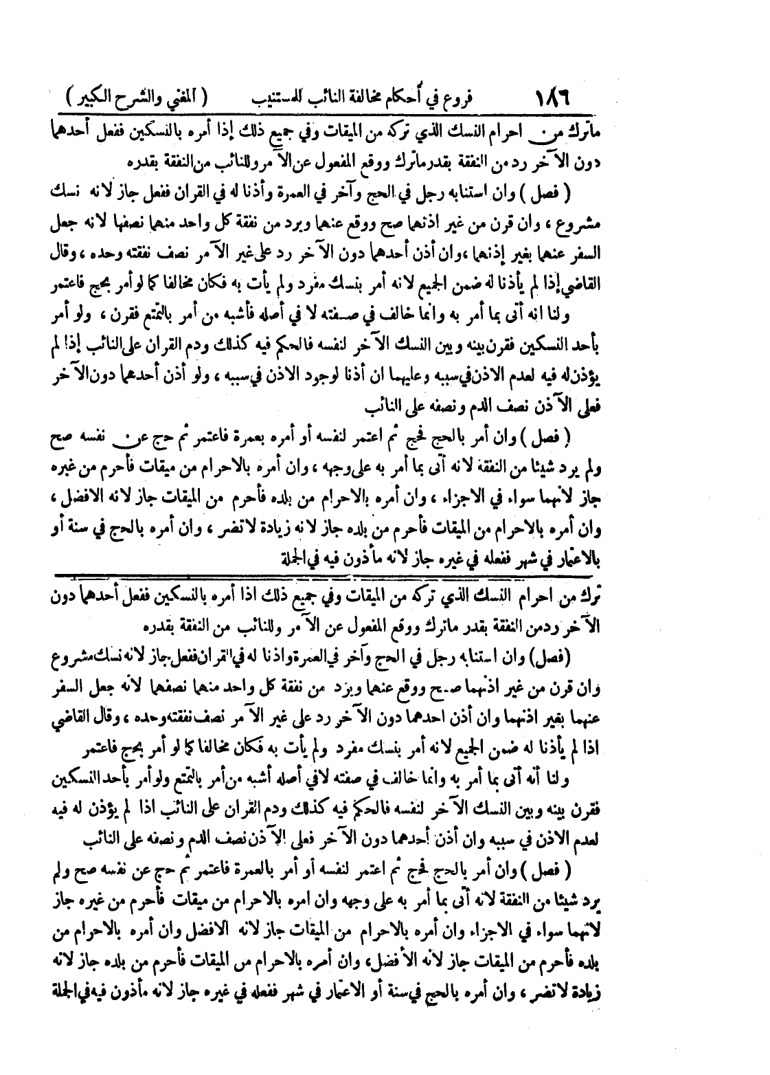 ترك من إحرام النسك الذي تركه من الميقات وفي جميع ذلك إذا أمره بالنسكين ففعل أحدهما دون الآخر رد من النفقة بقدر ما ترك ووقع المفعول عن الآمر وللنائب من النفقة بقدره (فصل) وإن استنابه رجل في الحج وآخر في العمرة واذنا له في القرآن ففعل جاز لأنه نسك مشروع وإن قرن من غير إذنهما صح ووقع عنهما ويرد من نفقة كل واحد منهما نصفهما لأنه جعل السفر عنهما بغير إذنهما وإن أذن أحدهما دون الآخر رد على غير الآمر نصف نفقته وحده، وقال القاضي إذا لم يأذنا له ضمن الجميع لأنه أمر بنسك مفرد ولم يأت به فكان مخالفاً كما لو أمر بحج فاعتمر ولنا أنه أتى بما أمر به وإنما خالف في صفته لافي أصله أشبه من أمر بالتمتع ولو أمر بأحد النسكين فقرن بينه وبين النسك الآخر لنفسه فالحكم فيه كذلك ودم القرآن على النائب إذا لم يؤذن له فيه لعدم الإذن في سببه وإن أذن أحدهما دون الآخر فعلى الآذن نصف الدم ونصفه على النائب