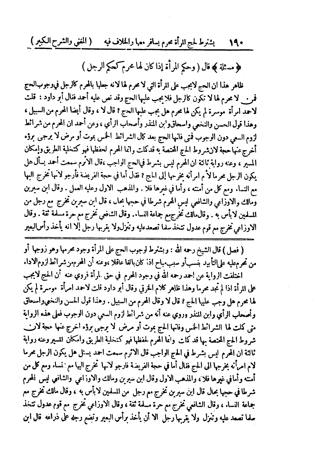 (فصل) قال الشيخ رحمه الله: ويشترط لوجوب الحج على المرأة وجود محرمها وهو زوجها أو من تحرم عليه على التأبيد بنسب أو سبب مباح إذا كان بالغاً عاقلا، وعن أن المحرم من شرائط لزوم الأداء