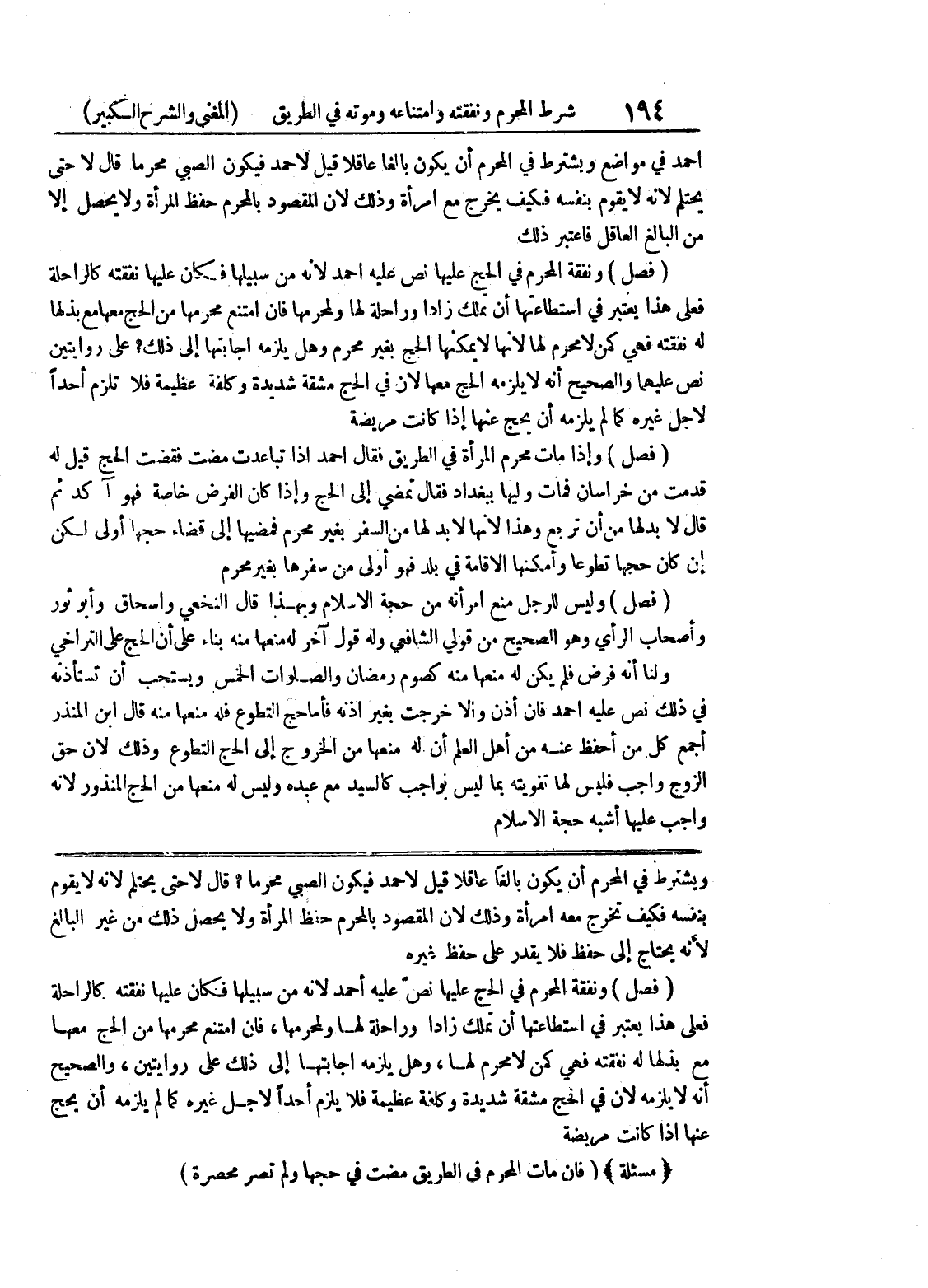 ويشترط في المحرم أن يكون بالغاً عاقلاً قيل لأحمد فيكون الصبي محرماً؟ قال لا حتى يحتلم لأنه لا يقوم بنفسه فكيف تخرج معه امرأة وذلك لأن المقصود بالمحرم حفظ المرأة ولا يحصل ذلك من غير البالغ لأنه يحتاج إلى حفظ فلا يقدر على حفظ غيره (فصل) ونفقة المحرم في الحج عليها نص عليه أحمد لأنه من سبيلها فكان عليها نفقته كالراحلة فعلى هذا يعتبر في استطاعتها أن تملك زاداً وراحلة لها ولمحرمها، فإن امتنع محرمها من الحج معها