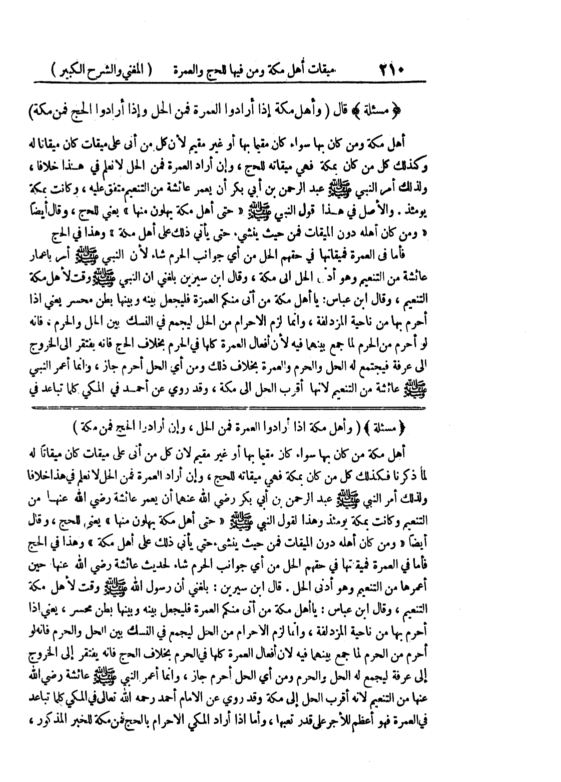 (مسألة) (وأهل مكة إذا أرادوا العمرة فمن الحل، وإن أرادوا الحج فمن مكة) أهل مكة من كان بها سواء كان مقيماً بها أو غير مقيم لأن كل من أتى على ميقات كان ميقاتاً له لما ذكرنا فكذلك كل من كان بمكة فهي ميقاته للحج، وإن أراد العمرة فمن الحل لا نعلم في هذا خلافا ولذلك أمر النبي صلى الله عليه وسلم عبد الرحمن بن أبي بكر رضي الله عنهما أن يعمر عائشة رضي الله عنها من التنعيم وكانت بمكة يومئذ وهذا لقول النبي صلى الله عليه وسلم " حتى أهل مكة يهلون منها " يعني للحج، وقال أيضاً " ومن كان أهله دون الميقات فمن حيث ينشئ حتى يأتي ذلك على أهل مكة " وهذا في الحج فأما في العمرة فميقتاتها في حقهم الحل من أي جوانب الحرم شاء لحديث عائشة رضي الله عنها حين أعمرها من التنعيم وهو أدنى الحل.