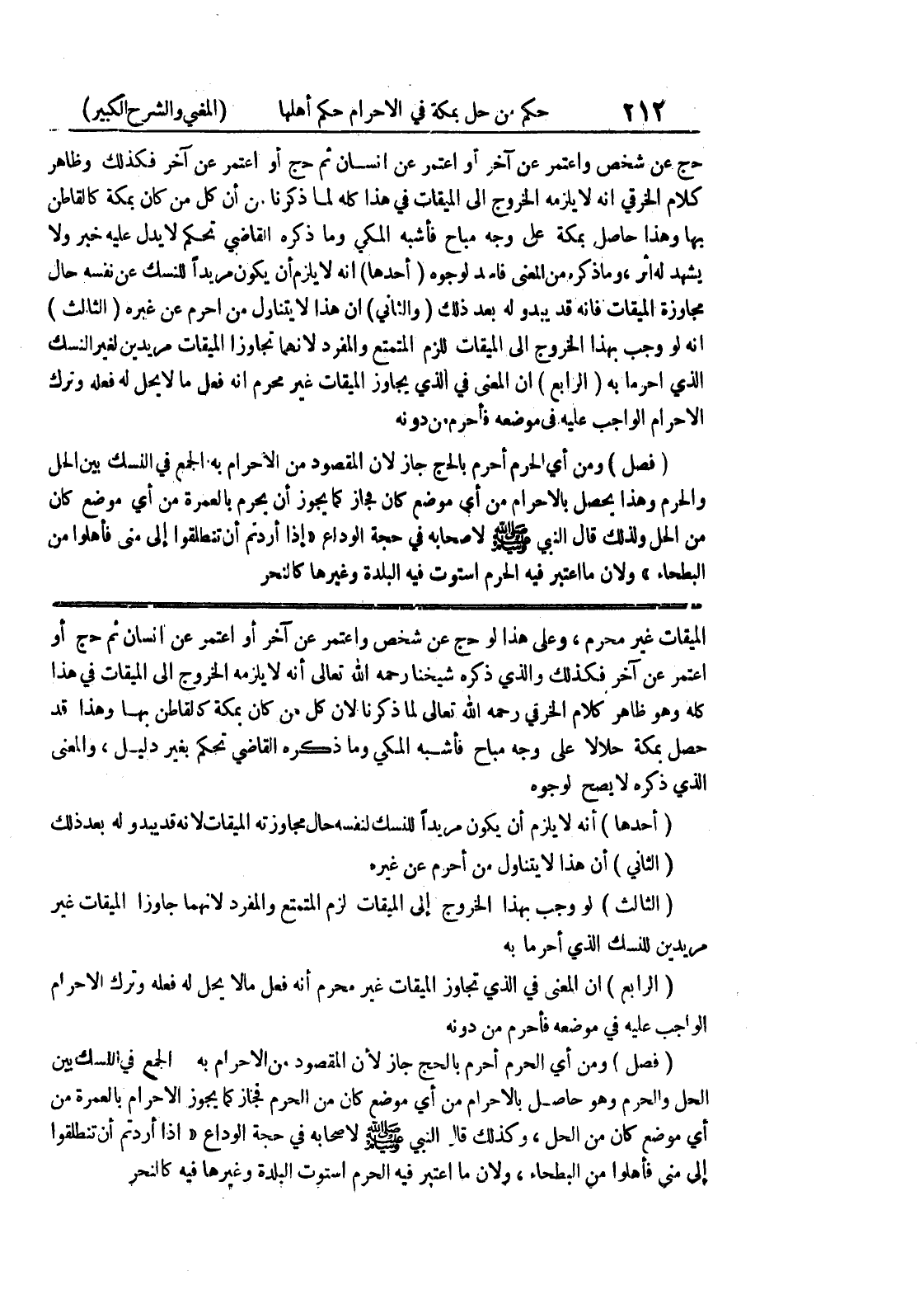 الميقات غير محرم، وعلى هذا لو حج عن شخص واعتمر عن آخر أو اعتمر عن إنسان ثم حج أو اعتمر عن آخر فكذلك والذي ذكره شيخنا رحمه الله تعالى أنه لا يلزمه الخروج إلى الميقات في هذا كله وهو ظاهر كلام الخرقي رحمه الله تعالى لما ذكرنا لأن كل من كان بمكة كالقاطن بها وهذا قد حصل بمكة حلالاً على وجه مباح فأشبه المكي وما ذكره القاضي تحكم بغير دليل، والمعنى الذي ذكره لا يصح لوجوه (أحدها) أنه لا يلزم أن يكون مريداً للنسك لنفسه حال مجاوزته الميقات لأنه قد يبدو له بعد ذلك (الثاني) أن هذا لا يتناول من أحرم عن غيره (الثالث) لو وجب بهذا الخروج إلى الميقات لزم المتمتع والمفرد لأنهما جاوزا الميقات غير مريدين للنسك الذي أحرما به (الرابع) أن المعنى في الذي تجاوز الميقات غير محرم أنه فعل مالا يحل له فعله وترك الإحرام الواجب عليه في موضعه فأحرم من دونه (فصل) ومن أي الحرم أحرم بالحج جاز لأن المقصود من الإحرام به الجمع في النسك بين الحل والحرم وهو حاصل بالإحرام من أي موضع كان من الحرم فجاز كما يجوز الإحرام بالعمرة من