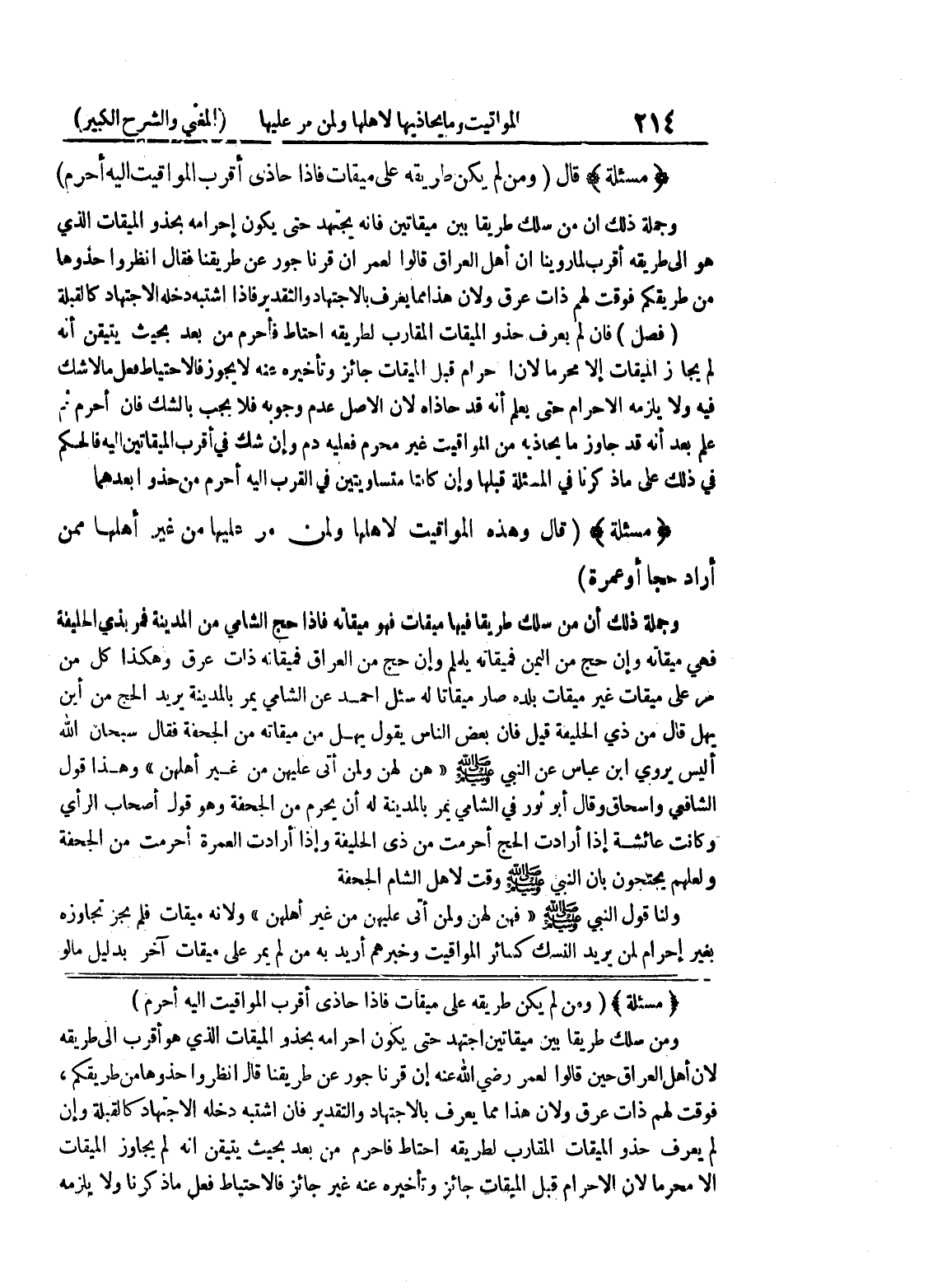 (مسألة) (ومن لم يكن طريقه على ميقات فإذا حاذى أقرب المواقيت إليه أحرم) ومن سلك طريقاً بين ميقاتين اجتهد حتى يكون إحرامه بحذو الميقات الذي هو أقرب إلى طريقه لأن أهل العراق قالوا لعمر رضي الله عنه إن قرنا جور على طريقنا قال انظروا حذوها من طريقكم، فوقت لهم ذات عرق ولأن هذا مما يعرف بالاجتهاد والتقدير فإن اشتبه دخله الاجتهاد كالقبلة وإن لم يعرف حذو الميقات المقارب لطريقه احتاط فأحرم من بعد بحيث يتيقن أنه لم يجاوز الميقات إلا محرماً لأن الإحرام قبل الميقات جائز وتأخيره عنه غير جائز فالاحتياط فعل ما ذكرنا ولا يلزمه
