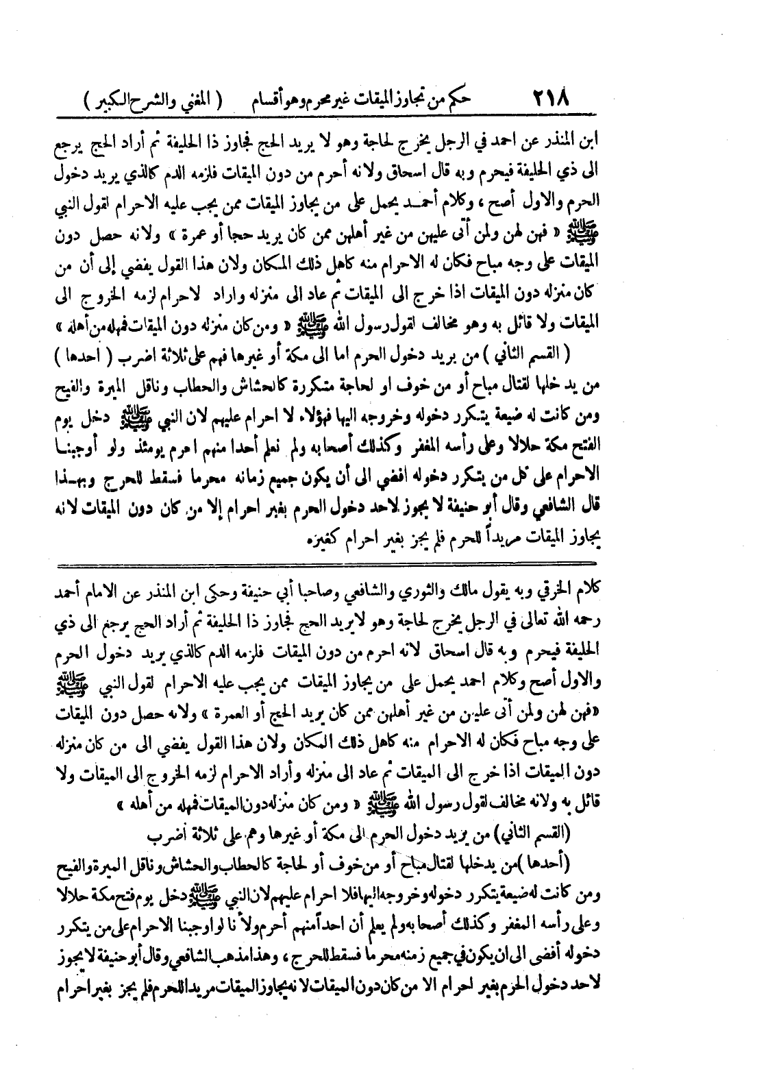 كلام الخرقي وبه يقول مالك والثوري والشافعي وصاحبا أبي حنيفة وحكى ابن المنذر عن الإمام أحمد رحمه الله تعالى في الرجل يخرج لحاجة وهو لا يريد الحج فجاوز ذا الحليفة ثم أراد الحج يرجع إلى ذي الحليفة فيحرم وبه قال إسحاق لأنه أحرم من دون الميقات فلزمه الدم كالذي يريد دخول الحرم والأول أصح وكلام أحمد يحمل على من يجاوز الميقات ممن يجب عليه الإحرام لقول النبي صلى الله عليه وسلم " فهن لهن ولمن أتى عليهن من غير أهلهن ممن كان يريد الحج أو العمرة " ولأنه حصل دون الميقات على وجه مباح فكان له الإحرام منه كأهل ذلك المكان ولأن هذا القول يفضي إلى من كان منزله دون الميقات إذا خرج إلى الميقات ثم عاد إلى منزله وأراد الإحرام لزمه الخروج إلى الميقات ولا قائل به ولأنه مخالف لقول رسول الله صلى الله عليه وسلم " ومن كان منزله دون الميقات فمهله من أهله " (القسم الثاني) من يريد دخول الحرم إلى مكة أو غيرها وهم على ثلاثة أضرب (أحدها) من يدخلها لقتال مباح أو من خوف أو لحاجة كالحطاب والحشاش وناقل الميرة والفيح ومن كانت له ضيعة يتكرر دخوله وخروجه إليها فلا إحرام عليهم لأن النبي صلى الله عليه وسلم دخل يوم فتح مكة حلالاً وعلى رأسه المغفر وكذلك أصحابه ولم يعلم أن أحداً منهم أحرم ولانا لو أوجبنا الإحرام على من يتكرر دخوله أفضى إلى أن يكون في جميع زمنه محرماً فسقط للحرج، وهذا مذهب الشافعي وقال أبو حنيفة لا يجوز لأحد دخول الحرم بغير إحرام إلا من كان دون الميقات لأنه يجاوز الميقات مريداً للحرم فلم يجز بغير إحرام