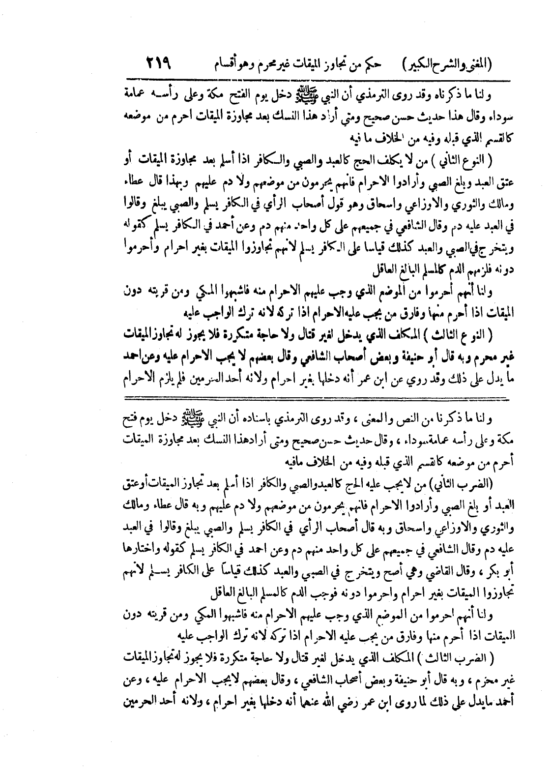 أحرم من موضعه كالقسم الذي قبله وفيه من الخلاف ما فيه (الضرب الثاني) من لا يجب عليه الحج كالعبد والصبي والكافر إذا أسلم بعد تجاوز الميقات أو عتق العبد أو بلغ الصبي وأرادوا الإحرام فإنهم يحرمون من موضعهم ولا دم عليهم وبه قال عطاء ومالك والثوري والاوزاعي واسحاق وبه قال أصحاب الرأي في الكافر يسلم والصبي يبلغ وقالوا في العبد عليه دم وقال الشافعي في جميعهم على كل واحد منهم دم وعن أحمد في الكافر يسلم كقوله واختارها أبو بكر، وقال القاضي وهي أصح ويتخرج في الصبي والعبد كذلك قياساً على الكافر يسلم لأنهم تجاوزوا الميقات بغير إحرام وأحرموا دونه فوجب الدم كالمسلم البالغ العاقل ولنا أنهم احرموا من الموضع الذي وجب عليهم الإحرام منه فأشبهوا المكي ومن قريته دون الميقات إذا أحرم منها وفارق من يجب عليه الإحرام إذا تركه لأنه ترك الواجب عليه (الضرب الثالث) المكلف الذي يدخل لغير قتال ولا حاجة متكررة فلا يجوز له تجاوز الميقات غير محرم، وبه قال أبو حنيفة وبعض أصحاب الشافعي، وقال بعضهم لا يجب الإحرام عليه، وعن أحمد ما يدل على ذلك لما روى ابن عمر رضي الله عنهما أنه دخلها بغير إحرام، ولأنه أحد الحرمين