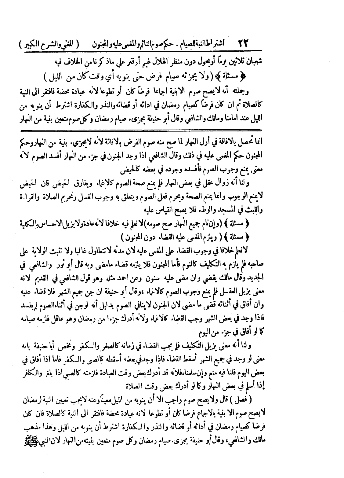 إنما تحصل بالإفاقة في أول النهار لما صح منه صوم الفرض بالإفاقة لانه لا يجزي بنية من النهار وحكم المجنون حكم المغمى عليه في ذلك وقال الشافعي إذا وجد الجنون في جزء من النهار أفسد الصوم لأنه معنى يمنع وجوب الصوم فأفسده وجوده في بعضه كالحيض ولنا أنه زوال عقل في بعض النهار فلم يمنع صحة الصوم كالإغماء ويفارق الحيض فإن الحيض لا يمنع الوجوب وإنما يمنع الصحة ويحرم فعل الصوم ويتعلق به وجوب الغسل وتحريم الصلاة والقراءة واللبث في المسجد والوطئ فلا يصح القياس عليه (مسألة) (وإن نام جميع النهار صح صومه) لا نعلم فيه خلافا لأنه عادة ولا يزيل الإحساس بالكلية (مسألة) (ويلزم المغمى عليه القضاء دون الجنون) لا نعلم خلافاً في وجوب القضاء على المغمى عليه لأن مدته لا تتطاول غالباً ولا تثبت الولاية على صاحبه فلم يلزم به التكليف كالنوم فأما الجنون فلا يلزمه قضاء ما مضى وبه قال أبو ثور والشافعي في