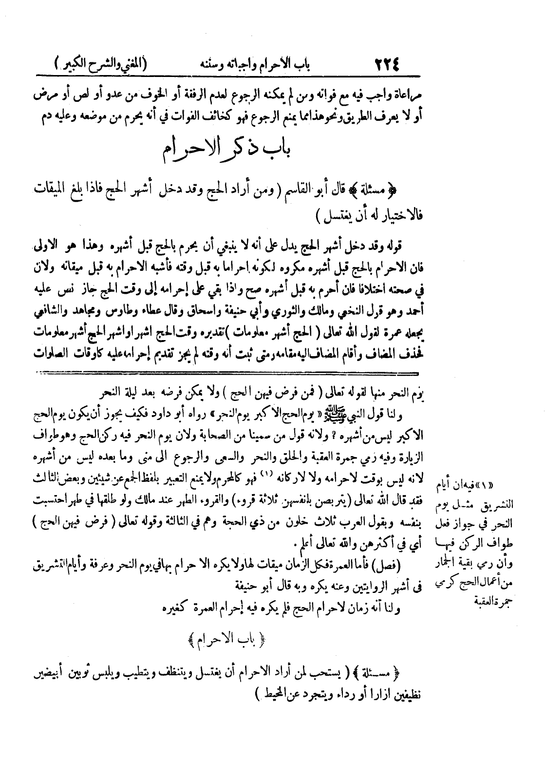 الزيارة وفيه رمي جمرة العقبة والحلق والنحر والسعي والرجوع إلى منى وما بعده ليس من أشهره لأنه ليس بوقت لإحرامه ولا لأركانه (1) فهو كالمحرم ولا يمنع التعبير بلفظ الجمع عن شيئين وبعض الثالث فقد قال الله تعالى (يتربصن بأنفسهن ثلاثة قروء) والقروء الطهر عند مالك ولو طلقها في طهر احتسبت بنفسه وبقول العرب ثلاث خلون من ذي الحجة وهم في الثالثة وقوله تعالى (فرض فيهن الحج) أي في أكثرهن والله تعالى أعلم (فصل) فأما العمرة فكل الزمان ميقات لها ولا يكره الإحرام بها في يوم النحر وعرفة وأيام التشريق في أشهر الروايتين وعنه يكره وبه قال أبو حنيفة ولنا أنه زمان لإحرام الحج فلم يكره فيه إحرام العمرة كغيره (باب الإحرام) (مسألة) (يستحب لمن أراد الإحرام أن يغتسل ويتنظف ويتطيب ويلبس ثوبين أبيضين نظيفين ازارا أو رداء ويتجرد عن المخيط)