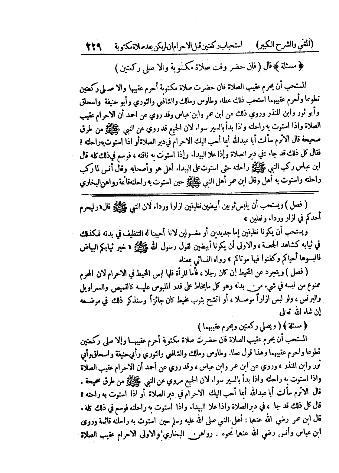 أحدكم في إزار ورداء ونعلين " ويستحب أن يكونا نظيفين إما جديدين أو مفسولين لأنا أحببنا له التنظيف في بدنه فكذلك في ثيابه كشاهد الجمعة، والأولى أن يكونا أبيضين لقول رسول الله صلى الله عليه وسلم " خير ثيابكم البياض فألبسوها أحياكم وكفنوا فيها موتاكم " رواه النسائي بمعناه (فصل) ويتجرد عن المخيط إن كان رجلاً، فأما المرأة فلها ليس لبس المخيط في الإحرام لأن المحرم ممنوع من لبسه في شئ من بدنه وهو كل ما يخاط على قدر الملبوس عليه كالقميص والسراويل والبرنس، ولو لبس إزاراً موصلاً، أو اتشح بثوب مخيط كان جائزاً وسنذكر ذلك في موضعه إن شاء الله تعالى (مسألة) (ويصلي ركعتين ويحرم عقيبهما) المستحب أن يحرم عقيب الصلاة فإن حضرت صلاة مكتوبة أحرم عقيبها وإلا صلى ركعتين تطوعاً وأحرم عقيبهما وهذا قول عطاء وطاوس ومالك والشافعي والثوري وأبي حنيفة واسحاق وأبي ثور وابن المنذر، وروي عن ابن عمر وابن عباس، وقد روي عن أحمد أن الإحرام عقيب الصلاة وإذا استوت به راحلته وإذا بدأ السير سواء لأن الجميع مروي عن النبي صلى الله عليه وسلم من طرق صحيحة.