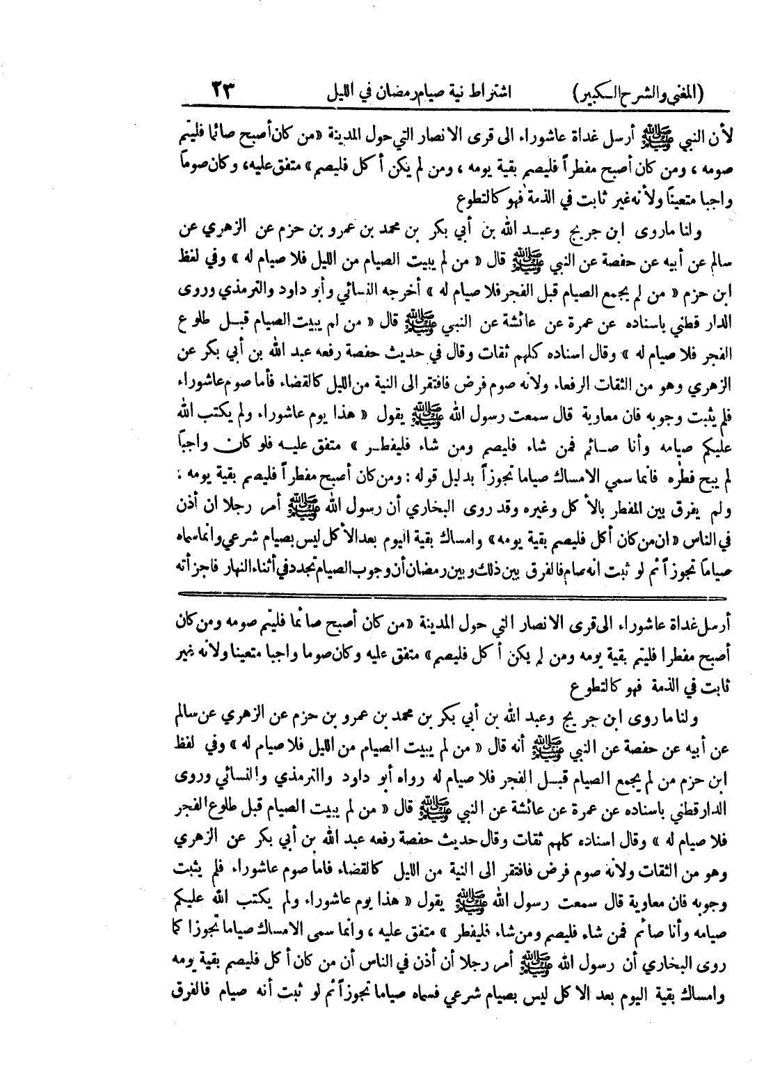 أرسل غداة عاشوراء إلى قرى الأنصار التي حول المدينة " من كان أصبح صائماً فليتم صومه ومن كان أصبح مفطراً فليتم بقية يومه ومن لم يكن أكل فليصم " متفق عليه وكان صوماً واجباً متعيناً ولأنه غير ثابت في الذمة فهو كالتطوع ولنا ما روى ابن جريج وعبد الله بن أبي بكر بن محمد بن عمرو بن حزم عن الزهري عن سالم عن أبيه عن حفصة عن النبي صلى الله عليه وسلم أنه قال " من لم يبيت الصيام من الليل فلا صيام له " وفي لفظ ابن حزم من لم يجمع الصيام قبل الفجر فلا صيام له ورواه أبو داود والترمذي والنسائي وروى الدارقطني بإسناده عن عمرة عن عائشة عن النبي صلى الله عليه وسلم قال " من لم يبيت الصيام قبل طلوع الفجر فلا صيام له " وقال إسناده كلهم ثقات وقال حديث حفصة رفعه عبد الله بن أبي بكر عن الزهري