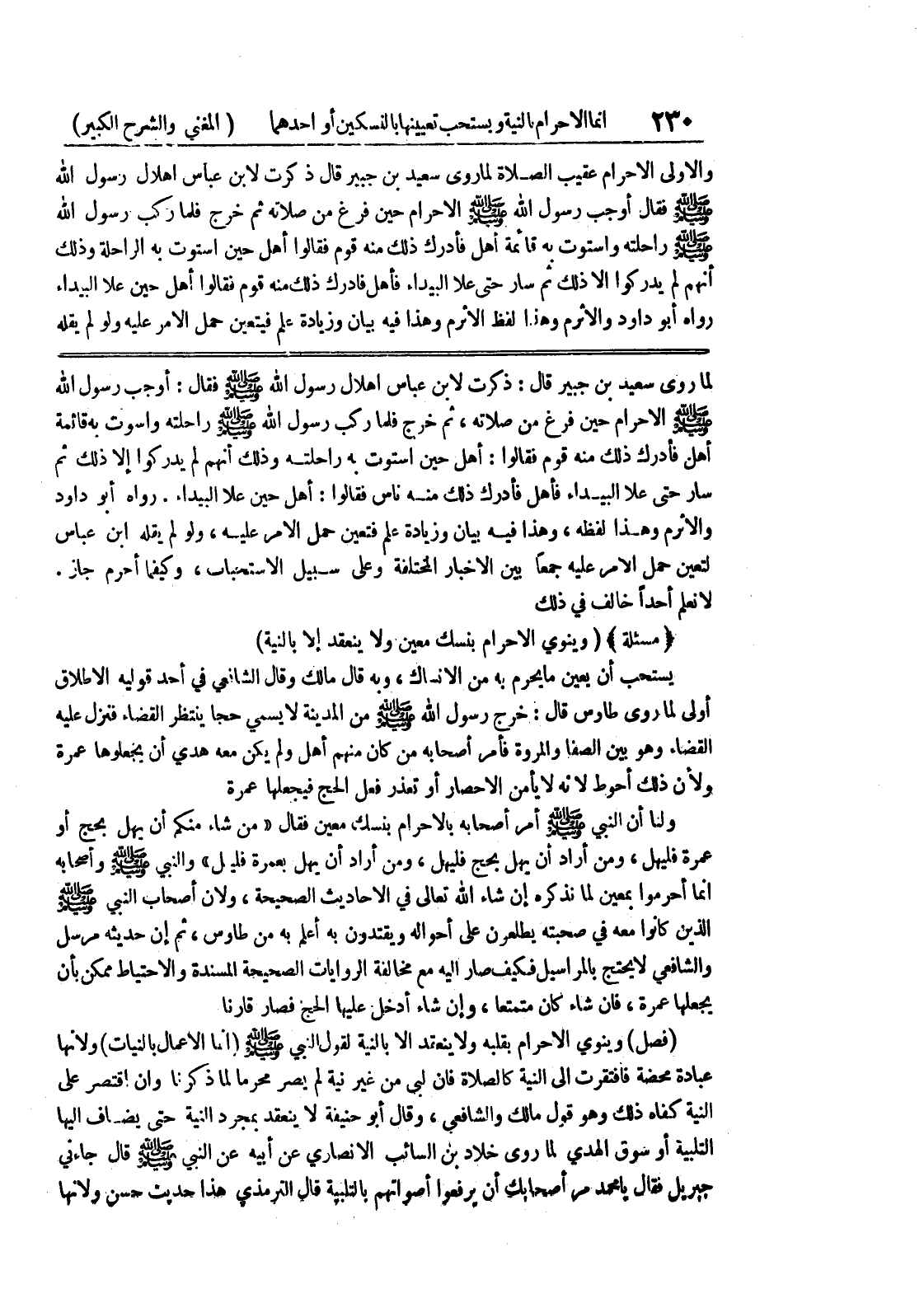 لا نعلم أحدا خالف في ذلك (مسألة) (وينوي الإحرام بنسك معين ولا ينعقد إلا بالنية) يستحب أن يعين ما يحرم به من الإنساك، وبه قال مالك وقال الشافعي في أحد قوليه الإطلاق أولى لما روي طاوس قال: خرج رسول الله صلى الله عليه وسلم من المدينة لا يسمي حجاً ينتظر القضاء فنزل عليه القضاء وهو بين الصفا والمروة فأمر أصحابه من كان منهم أهل ولم يكن معه هدي أن يجعلوها عمرة ولأن ذلك أحوط لأنه لا يأمن الإحصار أو تعذر فعل الحج فيجعلها عمرة ولنا أن النبي صلى الله عليه وسلم أمر أصحابه بالإحرام بنسك معين فقال " من شاء منكم أن يهل بالحج أو عمرة فليهل، ومن أراد أن يهل بحج فليهل، ومن أراد أن يهل بعمرة فليهل " والنبي صلى الله عليه وسلم وأصحابه إنما أحرموا بمعين لما نذكره إن شاء الله تعالى في الأحاديث الصحيحة، ولأن أصحاب النبي صلى الله عليه وسلم الذين كانوا معه في صحبته يطلعون على أحواله ويقتدون به أعلم به من طاوس، ثم إن حديثه مرسل والشافعي لا يحتج بالمراسيل فكيف صار إليه مع مخالفه الروايات الصحيحة المسندة والاحتياط ممكن بأن يجعلها عمرة، فإن شاء كان متمتعاً، وإن شاء أدخل عليها الحج فصار قارناً (فصل) وينوي الإحرام بقلبه ولا ينعقد إلا بالنية لقول البني صلى الله عليه وسلم (إنما الأعمال بالنيات) ولأنها عبادة محضة فافتقرت إلى النية كالصلاة فإن لبى من غير نية لم يصر محرماً لما ذكرنا وإن اقتصر على النية كفاه ذلك وهو قول مالك والشافعي، وقال أبو حنيفة لا ينعقد بمجرد النية حتى يضاف إليها التلبية أو سوق الهدي لما روى خلاد بن السائب الانصاري عن أبيه عن النبي صلى الله عليه وسلم قال جاءني جبريل فقال يا محمد مر أصحابك أن يرفعوا أصواتهم بالتلبية قال الترمذي هذا حديث حسن ولأنها