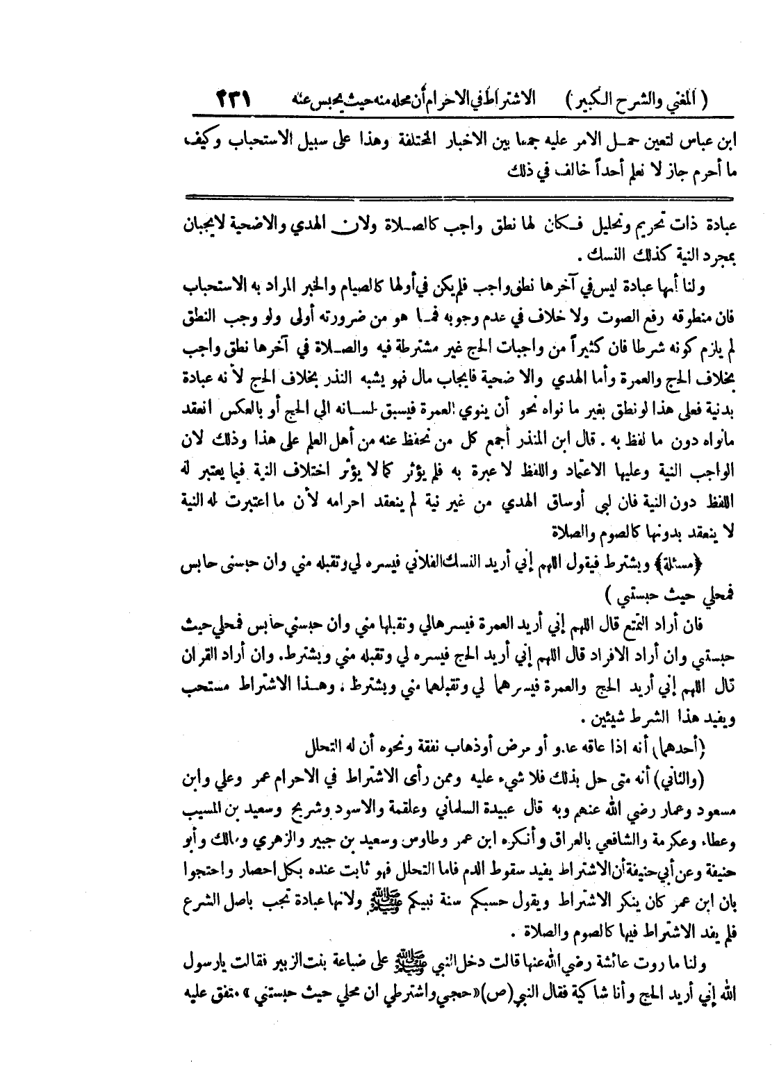 (أحدهما) أنه إذا عاقه عدو أو مرض أو ذهاب نفقة ونحوه أن له التحلل (والثاني) أنه متى حل بذلك فلا شئ عليه وممن رأى الاشتراط في الإحرام عمر وعلي وابن مسعود وعمار رضي الله عنهم وبه قال عبيدة السلماني وعلقمة والاسود وشريح وسعيد بن المسيب وعطاء وعكرمة والشافعي بالعراق وأنكره ابن عمر وطاوس وسعيد بن جبير والزهري ومالك وأبو حنيفة وعن أبي حنيفة أن الاشتراط يفيد سقوط الدم فأما التحلل فهو ثابت عنده بكل إحصار واحتجوا بأن ابن عمر كان ينكر الاشتراط ويقول حسبكم سنة نبيكم صلى الله عليه وسلم ولأنها عبادة تجب بأصل الشرع فلم يفد الاشتراط فيها كالصوم والصلاة.