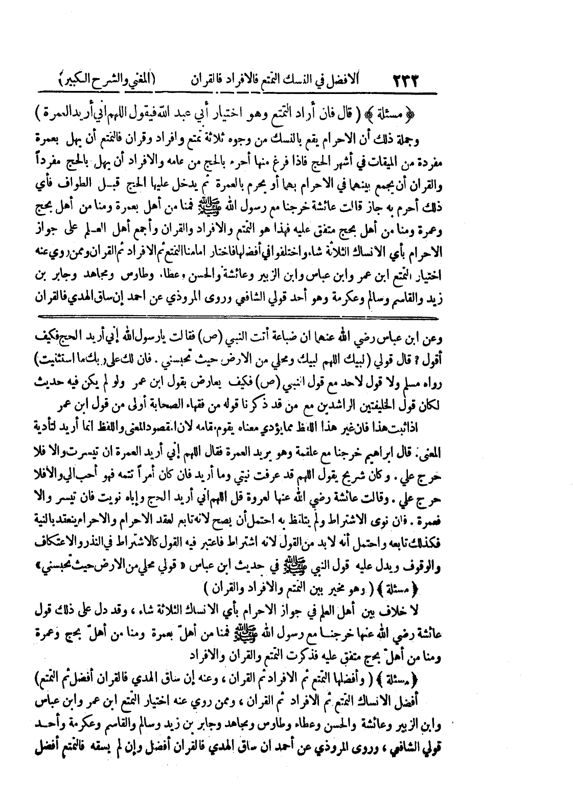فإن نوى الاشتراط ولم يتلفظ به احتمل أن يصح لأنه تابع لعقد الإحرام والإحرام ينعقد بالنية فكذلك تابعه واحتمل أنه لابد من القول لأنه اشتراط فاعتبر فيه القول كالاشتراط في النذر والاعتكاف والوقوف ويدل عليه قول النبي صلى الله عليه وسلم في حديث ابن عباس " قولي محلي من الأرض حيث تحبسني " (مسألة) (وهو مخير بين التمتع والإفراد والقران) لا خلاف بين أهل العلم في جواز الإحرام بأي الإنساك الثلاثة شاء، وقد دل على ذلك قول عائشة رضي الله عنها خرجنا مع رسول الله صلى الله عليه وسلم فمنا من أهل بعمرة ومنا من أهل بحج وعمرة ومن من أهل بحج متفق عليه فذكرت التمتع والقران والإفراد (مسألة) (وأفضلها التمتع ثم الإفراد ثم القران، وعنه إن ساق الهدي فالقران أفضل ثم التمتع) أفضل الإنساك التمتع ثم الإفراد ثم القران، وممن روي عنه اختيار التمتع ابن عمر وابن عباس وابن الزبير وعائشة والحسن وعطاء وطاوس ومجاهد وجابر بن زيد وسالم والقاسم وعكرمه وأحد قولي الشافعي، وروى المروذي عن أحمدان ساق الهدي فالقران أفضل وإن لم يسقه فالتمتع أفضل