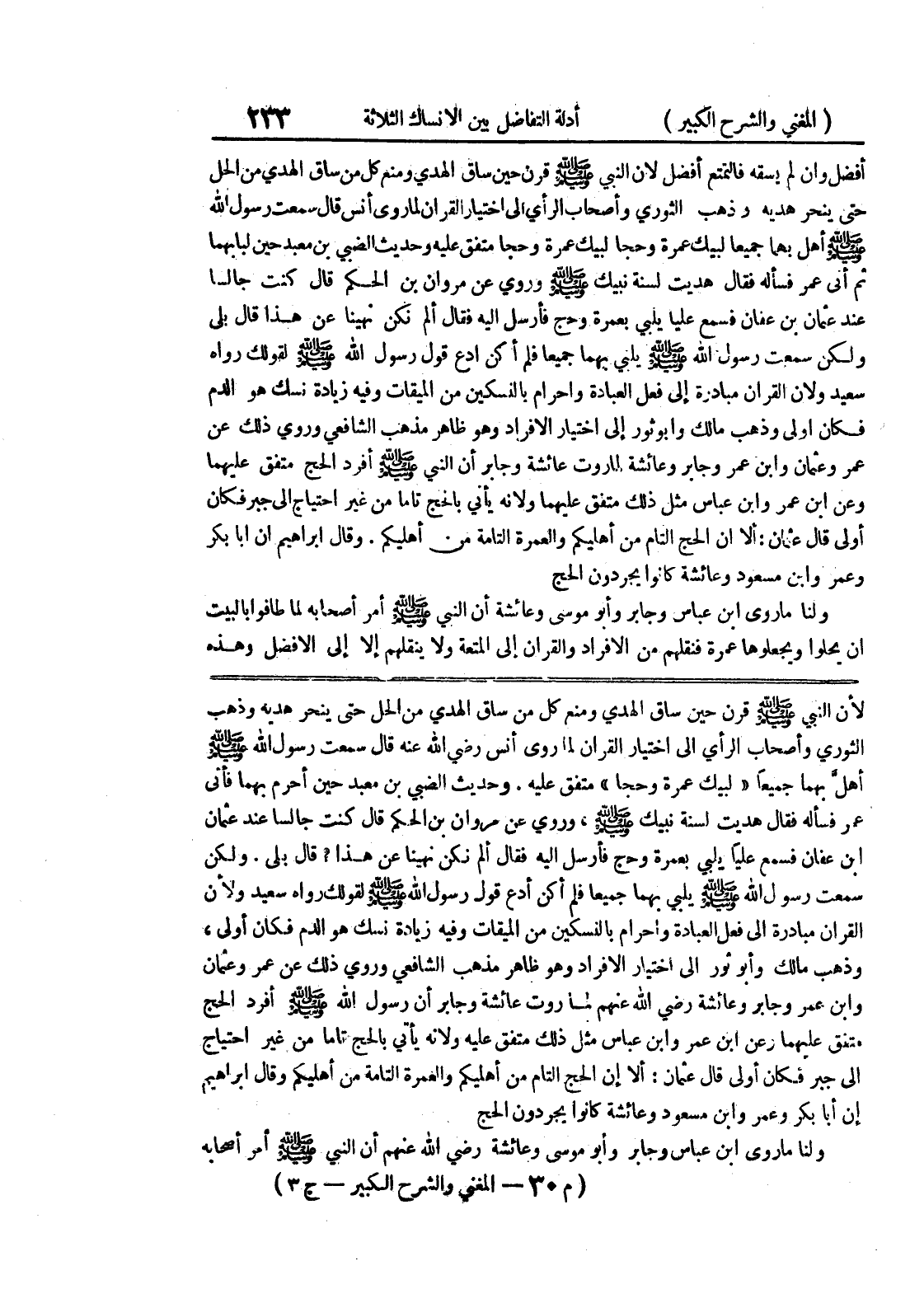 ولكن سمعت رسول الله صلى الله عليه وسلم يلبي بهما جميعاً فلم أكن أدع قول رسول الله صلى الله عليه وسلم لقولك رواه سعيد ولأن القران مبادرة إلى فعل العبادة وإحرام بالنسكين من الميقات وفيه زيادة نسك هو الدم فكان أولى، وذهب مالك وأبو ثور إلى اختيار الأفراد وهو ظاهر مذهب الشافعي وروي ذلك عن عمر وعثمان وابن عمر وجابر وعائشة رضي الله عنهم لما روت عائشة وجابر أن رسول الله صلى الله عليه وسلم أفرد الحج متفق عليهما وعن ابن عمر وابن عباس مثل ذلك متفق عليه ولأنه يأتي بالحج تاماً من غير احتياج إلى جبر فكان أولى قال عثمان: ألا إن الحج التام من أهليكم والعمرة التامة من أهليكم وقال إبراهيم أن أبا بكر وعمر وابن مسعود وعائشة كانوا يجردون الحج ولنا ما روى ابن عباس وجابر وأبو موسى وعائشة رضي الله عنهم أن النبي صلى الله عليه وسلم أمر أصحابه