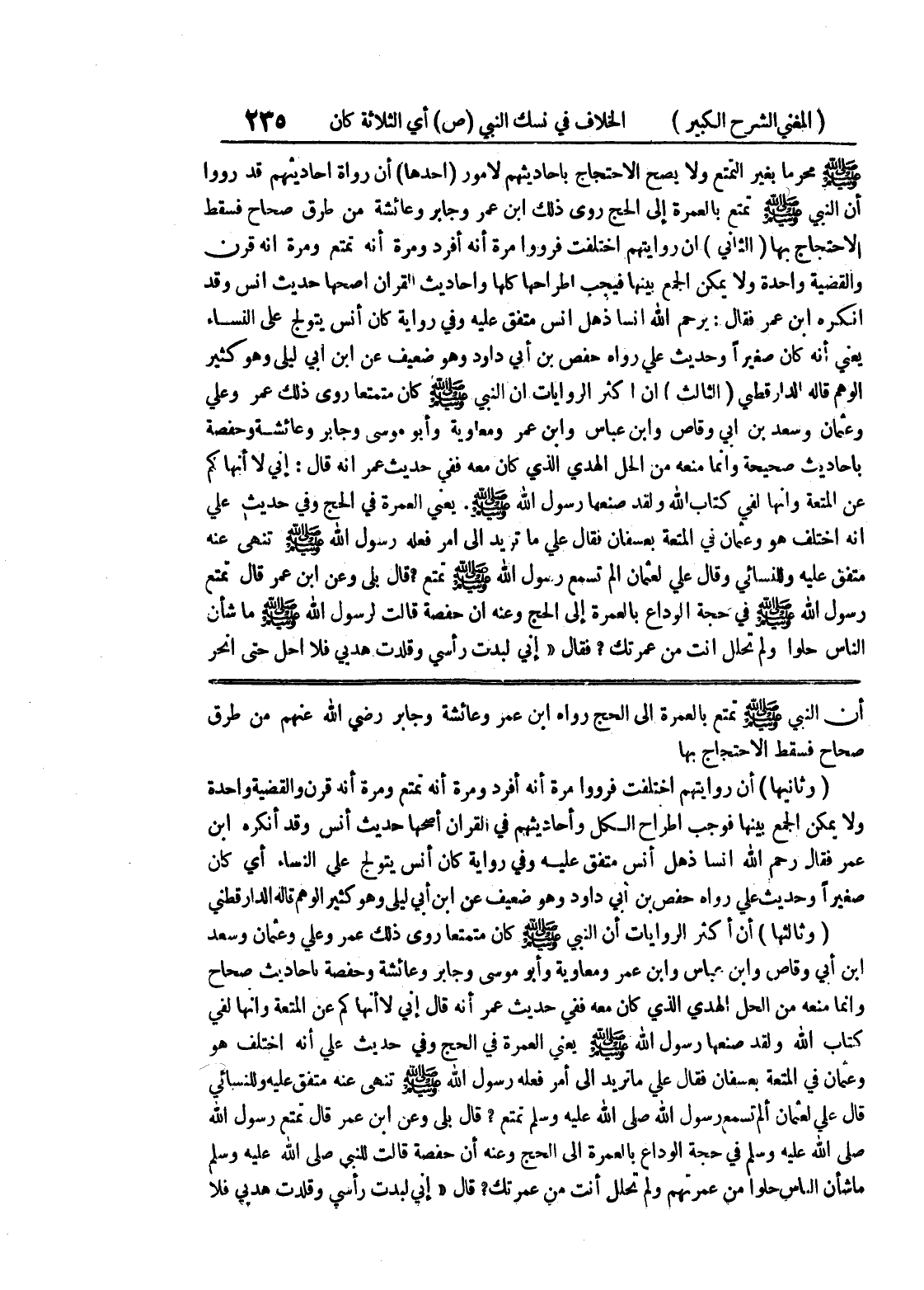 أن النبي صلى الله عليه وسلم تمتع بالعمرة إلى الحج رواه ابن عمر وعائشة وجابر رضي الله عنهم من طرق صحاح فسقط الاحتجاج بها (وثانيها) أن روايتهم اختلفت فرووا مرة أنه أفرد ومرة أنه تمتع ومرة أنه قرن والقضية واحدة ولا يمكن الجمع بينها فوجب اطراح الكل وأحاديثهم في القرآن أصحها حديث أنس وقد أنكره ابن عمر فقال رحم الله انسا ذهل أنس متفق عليه وفي رواية: كان أنس يتولج على النساء أي كان صغيراً وحديث علي رواه حفص بن أبي داود وهو ضعيف عن ابن أبي ليلى وهو كثير الوهم قاله الدارقطني (وثالثها) أن أكثر الروايات أن النبي صلى الله عليه وسلم كان متمتعاً روى ذلك عمر وعلي وعثمان وسعد ابن أبي وقاص وابن عباس وابن عمر ومعاوية وأبو موسى وجابر وعائشة وحفصة بأحاديث صحاح وإنما منعه من الحل الهدي الذي كان معه ففي حديث عمر أنه قال إني لا أنهاكم عن المتعة وإنها لفي كتاب الله ولقد صنعها رسول الله صلى الله عليه وسلم يعني العمرة في الحج وفي حديث علي أنه اختلف هو وعثمان في المتعة بعسفان فقال علي ما تريد إلى أمر فعله رسول الله صلى الله عليه وسلم تنهى عنه متفق عليه وللنسائي قال علي لعثمان ألم تسمع رسول الله صلى الله عليه وسلم تمتع؟ قال بلى وعن ابن عمر قال تمتع رسول الله صلى الله عليه وسلم في حجة الوداع بالعمرة إلى الحج وعنه أن حفصة قالت للنبي صلى الله عليه وسلم ما شأن الناس حلوا من عمرتهم ولم تحلل أنت من عمرتك؟ قال " إني لبدت رأسي وقلدت هديي فلا