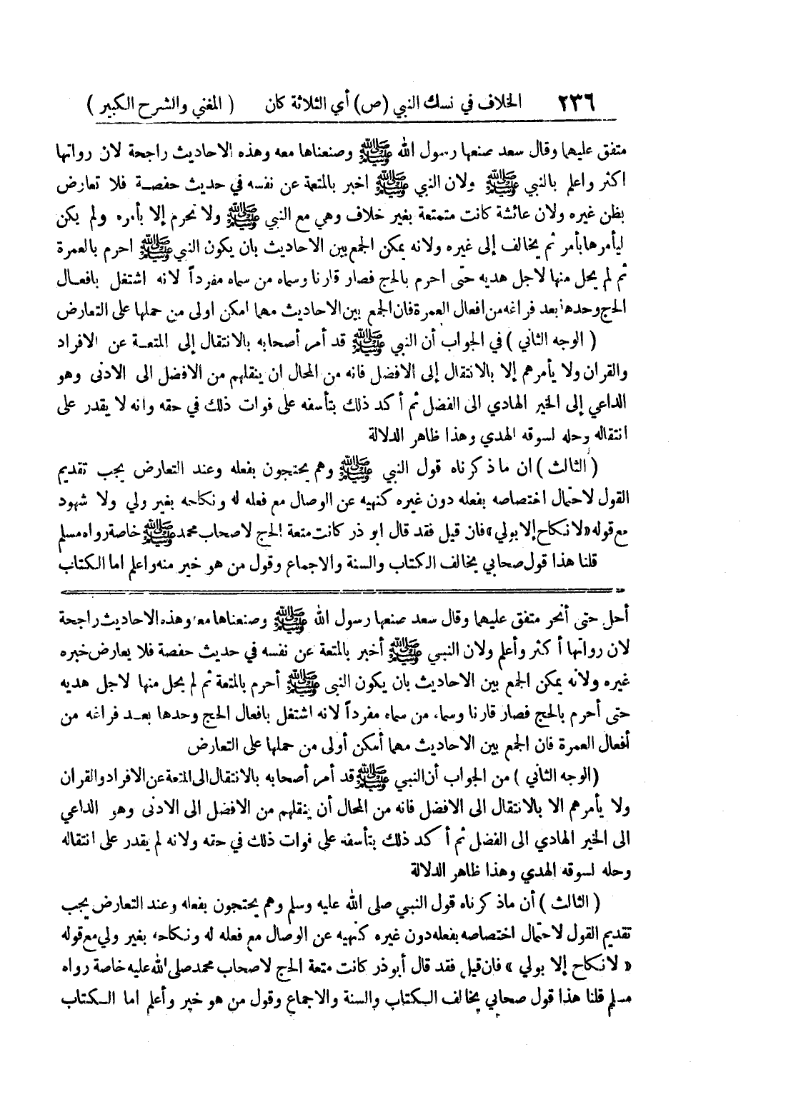 أحل حتى أنحر متفق عليهما وقال سعد صنعها رسول الله صلى الله عليه وسلم وصنعناها معه وهذه الأحاديث راجحة لأن رواتها أكثر وأعلم ولأن النبي صلى الله عليه وسلم أخبر بالمتعة عن نفسه في حديث حفصة فلا يعارض خبره غيره ولأنه يمكن الجمع بين الأحاديث بأن يكون النبي صلى الله عليه وسلم أحرم بالمتعة ثم لم يحل منها لأجل هديه حتى أحرم بالحج فصار قارناً وسماه من سماه مفرداً لأنه اشتغل بأفعال الحج وحدها بعد فراغه من أفعال العمرة فإن الجمع بين الأحاديث مهما أمكن أولى من حملها على التعارض (الوجه الثاني) من الجواب أن النبي صلى الله عليه وسلم قد أمر أصحابه بالانتقال إلى المتعة عن الافراد والقرآن ولا يأمرهم إلا بالانتقال إلى الأفضل فإنه من المحال أن ينقلهم من الأفضل إلى الأدنى وهو الداعي إلى الخير الهادي إلى الفضل ثم أكد ذلك بتأسفه على فوات ذلك في حقه ولأنه لا يقدر على انتقاله وحله لسوقه وهذا ظاهر الدلالة (الثالث) إن ما ذكرناه قول النبي صلى الله عليه وسلم وهم يحتجون بفعله وعند التعارض يجب تقديم القول لاحتمال اختصاصه بفعله دون غيره كنهيه عن الوصال مع فعله له ونكاحه بغير ولي مع قوله " لا نكاح إلا بولي " فإن قيل فقد قال أبو ذر كانت متعة الحج لأصحاب محمد صلى الله عليه وسلم خاصة رواه مسلم قلنا هذا قول صحابي يخالف الكتاب والسنة والإجماع وقول من هو خير وأعلم أما الكتاب