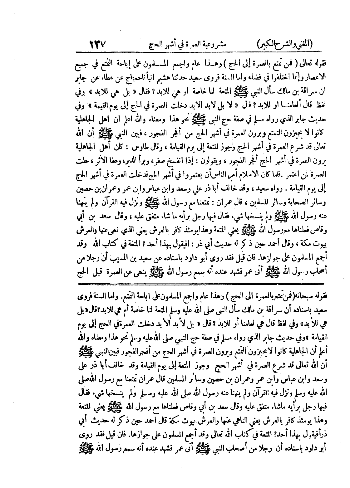 فقوله سبحانه (فمن تمتع بالعمرة إلى الحج) وهذا عام وأجمع المسلمون على إباحة التمتع، وأما السنة فروى سعيد بإسناده أن سراقة بن مالك سأل النبي صلى الله عليه وسلم المتعة لنا خاصة أم هي للأبد؟ قال " بل هي للأبد " وفي لفظ قال هي لعامنا أو للأبد؟ قال " بل لأبد الأبد دخلت العمرة في الحج إلى يوم القيامة " وفي حديث جابر الذي رواه مسلم في صفة حج النبي صلى الله عليه وسلم نحو هذا ومعناه والله أعلم أن الجاهلية كانوا لا يحيزون التمتع ويرون العمرة في أشهر الحج من أفجر الفجور فبين النبي صلى الله عليه وسلم إن الله تعالى قد شرع العمرة في أشهر الحج وجوز المتعة إلى يوم القيامة وقد خالف أبا ذر علي وسعد وابن عباس وابن عمر وعمران بن حصين وسائر المسلمين قال عمران تمتعنا مع رسول الله صلى الله عليه وسلم