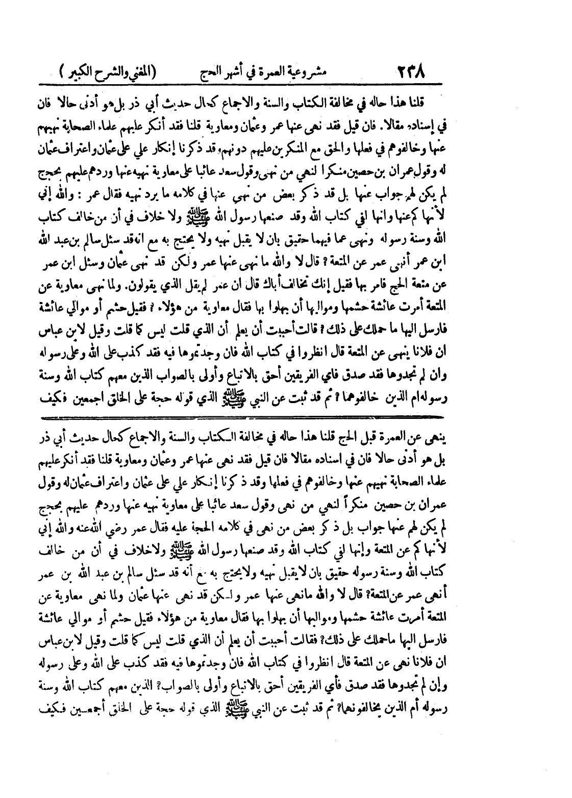 ينهى عن العمرة قبل الحج قلنا هذا حاله في مخالفة الكتاب والسنة والإجماع كحال حديث أبي ذر بل هو أدنى حالا فإن في إسناده مقالاً فإن قيل فقد نهى عنها عمر وعثمان ومعاوية قلنا فقد أنكر عليهم علماء الصحابة نهيهم عنها وخالفوهم في فعلها وقد ذكرنا إنكار علي على عثمان واعتراف عثمان له وقول عمران بن حصين منكراً لنهي من نهى وقول سعد عائباً على معاوية نهيه عنها وردهم عليهم بحجج لم يكن لهم عنها جواب بل ذكر بعض من نهى في كلامه الحجة عليه فقال عمر رضي الله عنه والله إني لأنهاكم عن المتعة وإنها لفي كتاب الله وقد صنعها رسول الله صلى الله عليه وسلم ولا خلاف في أن من خالف كتاب الله وسنة رسوله له حقيق بأن لا يقبل نهيه ولا يحتج به مع أنه قد سئل سالم بن عبد الله بن عمر أنهى عمر عن المتعة؟ قال لا والله ما نهى عنها عمر ولكن قد نهى عنها عثمان ولما نهى معاوية عن المتعة أمرت عائشة حشمها ومواليها أن يهلوا بها فقال معاوية من هؤلاء فقيل حشم أو موالي عائشة فأرسل إليها ما حملك على ذلك؟ فقالت أحببت أن يعلم أن الذي قلت ليس كما قلت وقيل لابن عباس أن فلانا نهى عن المتعة قال انظروا في كتاب الله فإن وجدتموها فيه فقد كذب على الله وعلى رسوله وإن لم تجدوها فقد صدق فأي الفريقين أحق بالاتباع وأولى بالصواب؟ الذين معهم كتاب الله وسنة رسوله أم الذين يخالفونهما؟ ثم قد ثبت عن النبي صلى الله عليه وسلم الذي قوله حجة على الخلق أجمعين فكيف