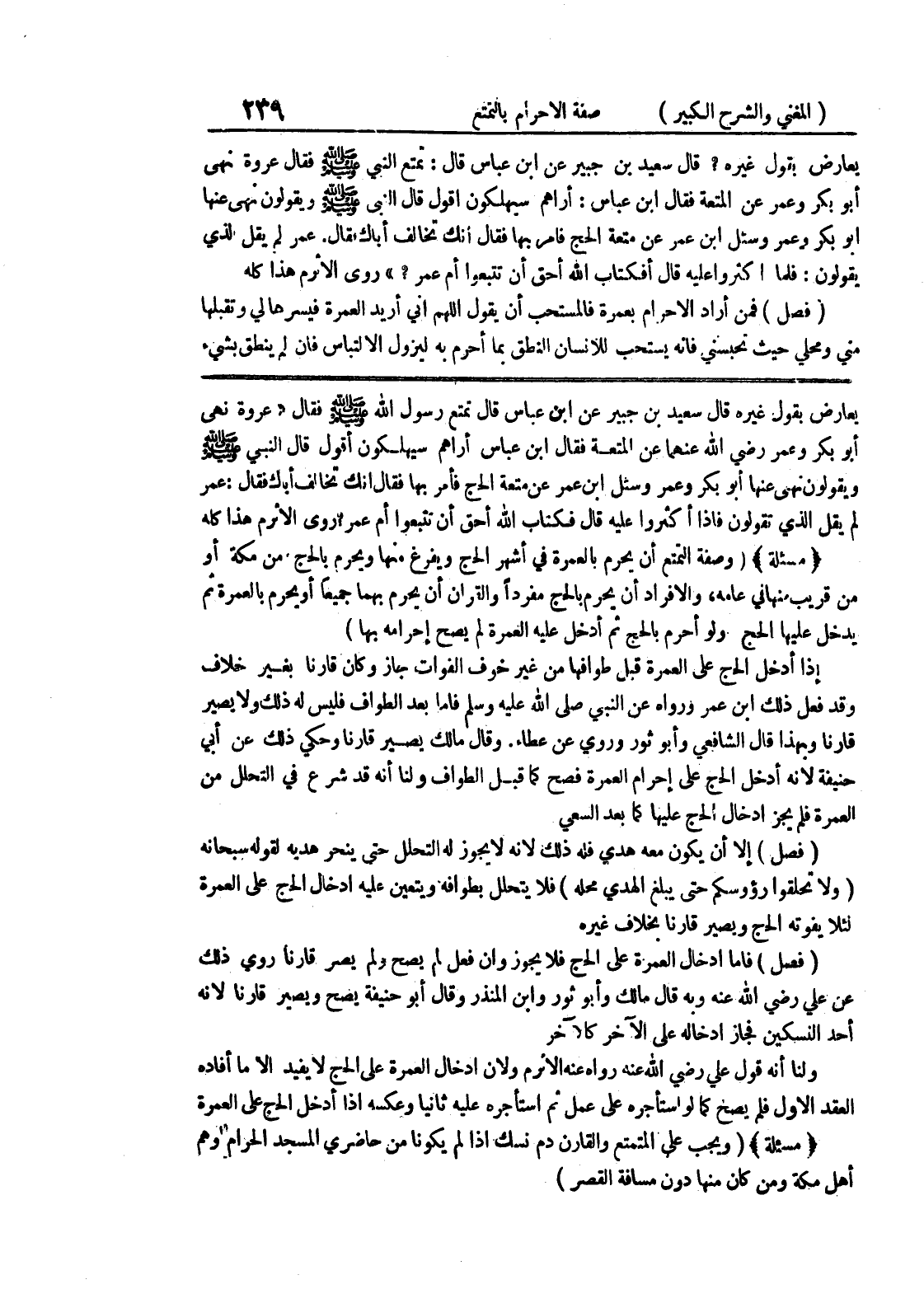 ويقولون نهى عنها أبو بكر وعمر وسئل ابن عمر عن متعة الحج فأمر بها فقال إنك تخالف أباك فقال: عمر لم يقل الذي تقولون فإذا أكثروا عليه قال فكتاب الله أحق أن تتبعوا أم عمر؟ روى الأثرم هذا كله (مسألة) (وصفة التمتع أن يحرم بالعمرة في أشهر الحج ويفرغ منها ويحرم بالحج من مكة أو من قريب منها في عامة، والإفراد أن يحرم بالحج مفرداً والقران أن يحرم بهما جميعاً أو يحرم بالعمرة ثم يدخل عليها الحج ولو أحرم بالحج ثم أدخل عليه العمرة لم يصح إحرامه بها) إذا أدخل الحج على العمرة قبل طوافها من غير خوف الفوات جاز وكان قارناً بغير خلاف وقد فعل ذلك ابن عمر ورواه عن النبي صلى الله عليه وسلم فأما بعد الطواف فليس له ذلك ولا يصير قارناً وبهذا قال الشافعي وابو ثور وروي عن عطاء، وقال مالك يصير قارناً وحكي ذلك عن أبي حنيفة لأنه أدخل الحج على إحرام العمرة فصح كما قبل الطواف ولنا أنه قد شرع في التحلل من العمرة فلم يجز إدخال الحج عليها كما بعد السعي (فصل) إلا أن يكون معه هدي فله ذلك لأنه لا يجوز له التحلل حتى ينحر هديه لقوله سبحانه (ولا تحلقوا رؤوسكم حتى يبلغ الهدي محله) فلا يتحلل بطوافه ويتعين عليه إدخال الحج على العمرة لئلا يفوته الحج ويصير قارناً بخلاف غيره (فصل) فأما إدخال العمرة على الحج فلا يجوز وإن فعل لم يصح ولم يصر قارناً روى ذلك عن علي رضي الله عنه وبه قال مالك وأبو ثور وابن المنذر وقال أبو حنيفة يصح ويصير قارناً لأنه أحد النسكين فجاز إدخاله على الآخر كالآخر ولنا أنه قول علي رضي الله عنه رواه عنه الأثرم ولأن إدخال العمرة على الحج لا يفيد إلا ما أفاده العقد الأول فلم يصح كما لو استأجره على عمل ثم استأجره عليه ثانياً وعكسه إذا أدخل الحج على العمرة (مسألة) (ويجب على المتمتع والقارن دم نسك إذا لم يكونا من حاضري المسجد الحرام وهم أهل مكة ومن كان منها دون مسافة القصر)
