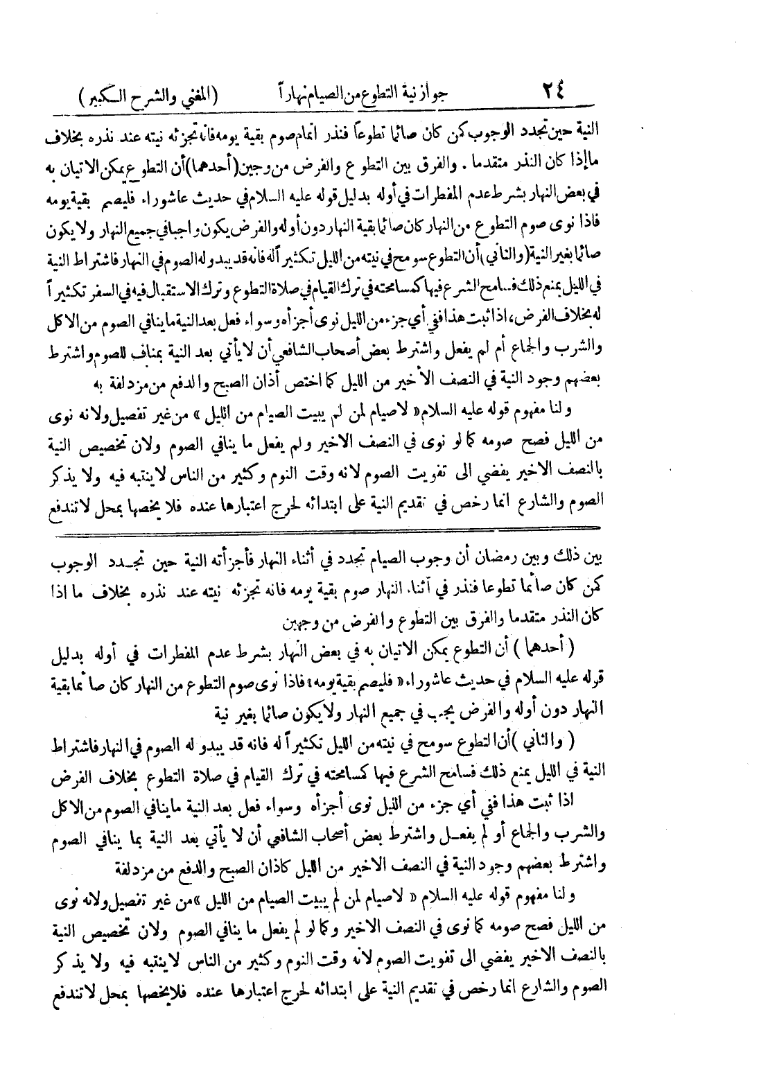 بين ذلك وبين رمضان أن وجوب الصيام تجدد في أثناء النهار فأجزأته النية حين تجدد الوجوب كمن كان صائماً تطوعاً فنذر في أثناء النهار صوم بقية يومه فإنه تجزئه نيته عند نذره بخلاف ما إذا كان النذر متقدماً والفرق بين التطوع والفرض من وجهين (أحدهما) أن التطوع يمكن الاتيان به في بعض النهار بشرط عدم المفطرات في أوله بدليل قوله عليه السلام في حديث عاشوراء " فليصم بقية يومه " فإذا نوى صوم التطوع من النهار كان صائماً بقية النهار دون أوله والفرض يجب في جميع النهار ولا يكون صائماً بغير نية (والثاني) أن التطوع سومح في نيته من الليل تكثيراً له فإنه قد يبدو له الصوم في النهار فاشتراط النية في الليل يمنع ذلك فسامح الشرع فيها كمسامحته في ترك الصلاة في صلاة التطوع بخلاف الفرض إذا ثبت هذا ففي أي جزء من الليل نوى أجزأه وسواء فعل بعد النية ما ينافي الصوم من الأكل والشرب والجماع أو لم يفعل واشترط بعض أصحاب الشافعي أن لا يأتي بعد النية بما ينافي الصوم واشترط بعضهم وجود النية في النصف الأخير من الليل كأذان الصبح والدفع من مزدلفة ولنا مفهوم قوله عليه السلام " لا صيام لمن لم يبيت الصيام من الليل " من غير تفصيل ولأنه نوى من الليل فصح صومه كما نوى في النصف الأخير وكما لو لم يفعل ما ينافي الصوم ولأن تخصيص النية بالنصف الأخير يفضي الى تفويت الصوم لأنه وقت النوم وكثير من الناس لا ينتبه فيه ولا يذكر الصوم والشارع انما رخص في تقديم النية على ابتدائه لحرج اعتبارها عنده فلا يخصها بمحل لا تندفع