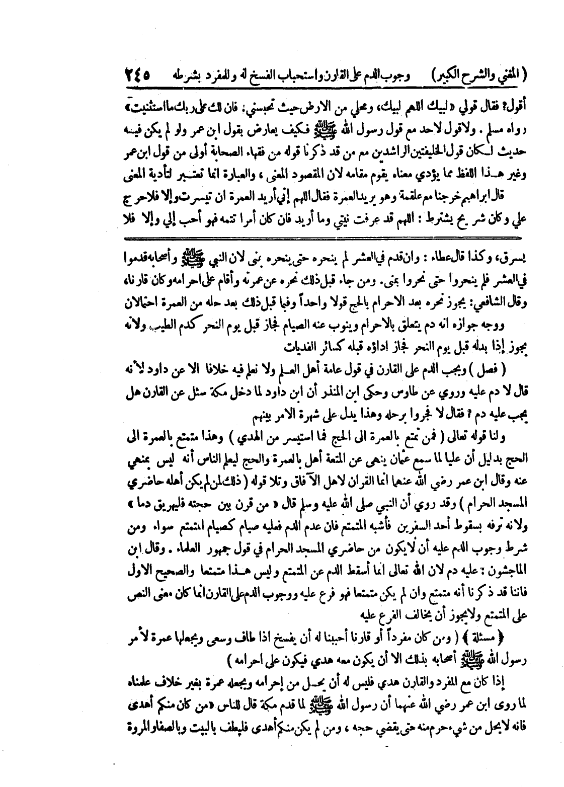 ومن جاء قبل ذلك نحره عن عمرته وأقام على إحرامه وكان قارنا، وقال الشافعي: يجوز نحره بعد الإحرام بالحج قولاً واحداً وفيما قبل ذلك بعد حله من العمرة احتمالان ووجه جوازه أنه دم يتعلق بالإحرام وينوب عنه الصيام فجاز قبل يوم النحر كدم الطيب ولأنه يجوز إذا بدله قبل يوم النحر فجاز اداؤه قبله كسائر الفديات (فصل) ويجب الدم على القارن في قول عامة أهل العلم ولا نعلم فيه خلافاً الا عن داود لأنه قال لا دم عليه وروي عن طاوس وحكى ابن المنذر إن ابن داود لما دخل مكة سئل عن القارن هل يجب عليه دم؟ فقال لا فجروا برحله وهذا يدل على شهرة الأمر بينهم ولنا قوله تعالى (فمن تمتع بالعمرة إلى الحج فما استيسر من الهدي) وهذا متمتع بالعمرة إلى الحج بدليل أن عليا لما سمع عثمان ينهى عن المتعة أهل بالعمرة والحج ليعلم الناس أنه ليس بمنهي عنه وقال ابن عمر رضي الله عنهما إنما القران لأهل الآفاق وتلا قوله (ذلك لمن لم يكن أهله حاضري المسجد الحرام) وقد روي أن النبي صلى الله عليه وسلم قال " من قرن بين حجته فليهريق دما " ولأنه ترفه بسقوط أحد السفرين فأشبه المتمتع فإن عدم الدم فعليه صيام كصيام المتمتع سواء ومن شرط وجوب الدم عليه أن لا يكون من حاضري المسجد الحرام في قول جمهور العلماء.