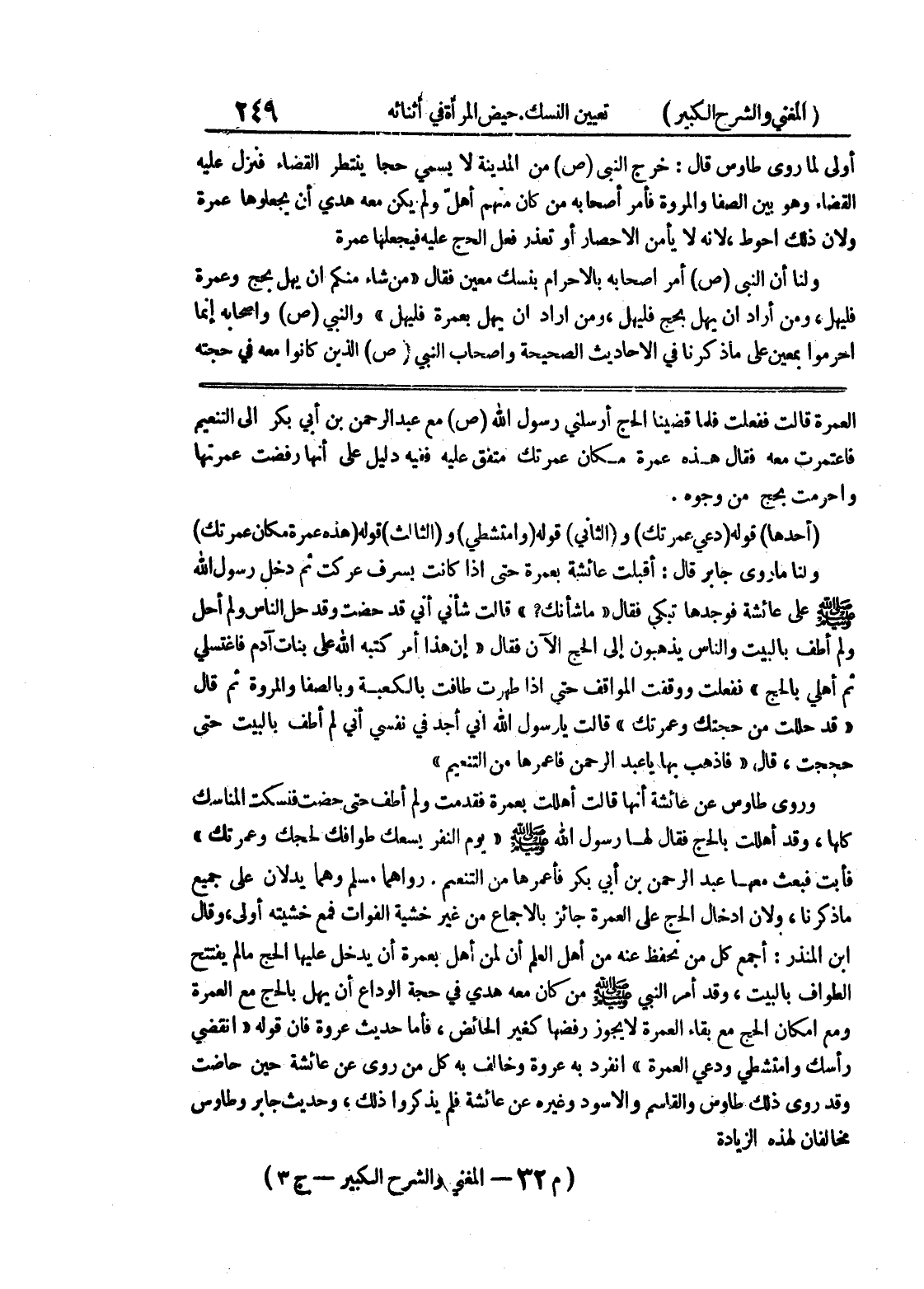 ابن المنذر: أجمع كل من نحفظ عنه من أهل العلم أن لمن أهل بالعمرة أن يدخل عليها الحج ما لم يفتتح الطواف بالبيت، وقد أمر النبي صلى الله عليه وسلم من كان معه هدي في حجة الوداع أن يهل بالحج مع العمرة ومع إمكان الحج مع بقاء العمرة لا يجوز رفضها كغير الحائض، فأما حديث عروة فإن قوله " انقضي رأسك وامتشطي ودعي العمرة " انفرد به عروة وخالف به كل من روي عن عائشة حين حاضت وقد روي ذلك طاوس والقاسم والاسود وغيره عن عائشة فلم يذكروا ذلك، وحديث جابر وطاوس مخالفان لهذه الزيادة