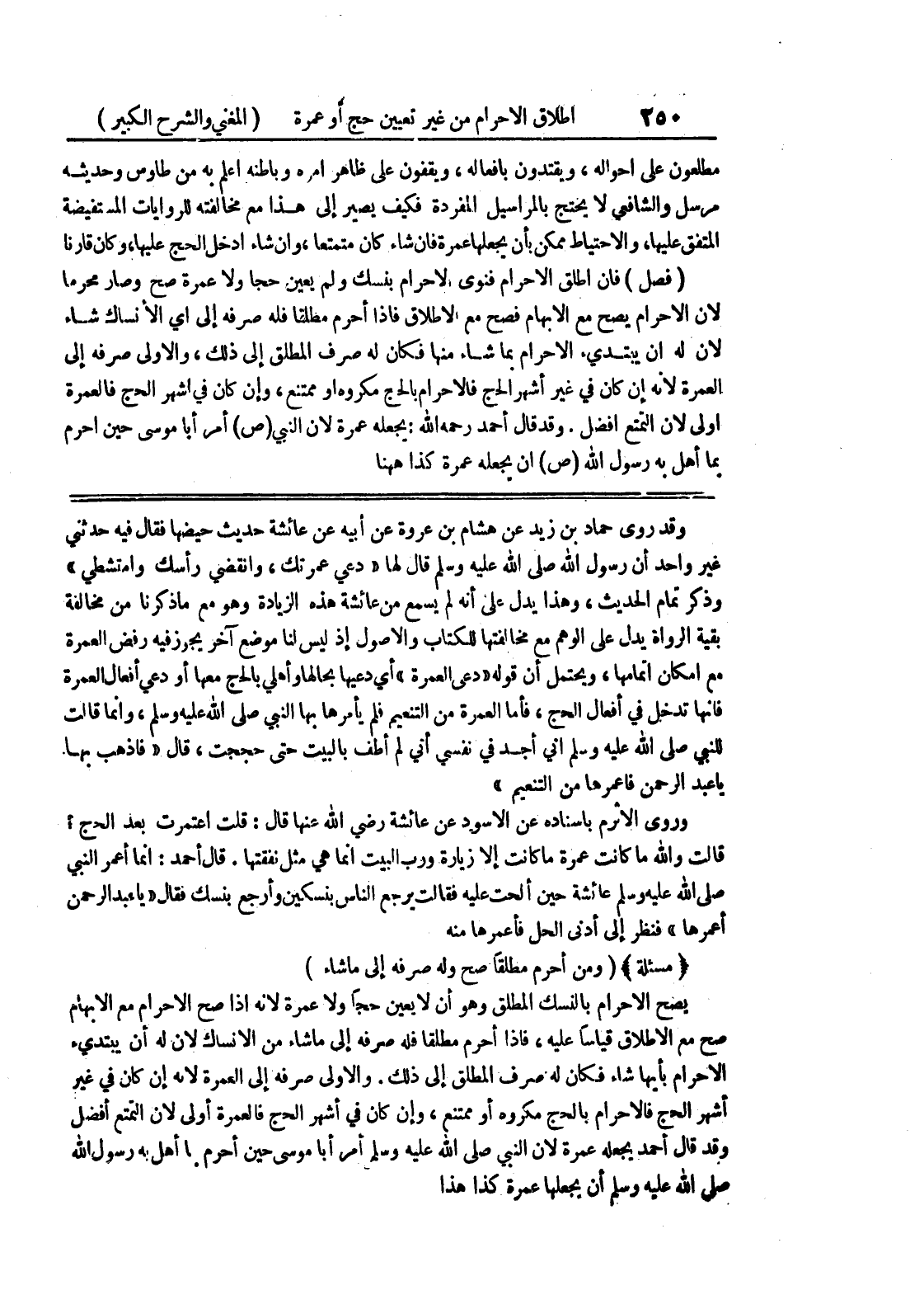 قال أحمد: إنما أعمر النبي صلى الله عليه وسلم عائشة حين ألحت عليه فقالت يرجع الناس بنسكين وأرجع بنسك فقال " يا عبد الرحمن أعمرها " فنظر إلى أدنى الحل فأعمرها منه (مسألة) (ومن أحرم مطلقا صح وله صرفه إلى ما شاء) يصح الإحرام بالنسك المطلق وهو أن لا يعين حجاً ولا عمرة لأنه إذا صح الإحرام مع الإبهام صح مع الإطلاق قياساً عليه، فإذا أحرم مطلقاً فله صرفه إلى ما شاء من الإنساك لأن له أن يبتدئ