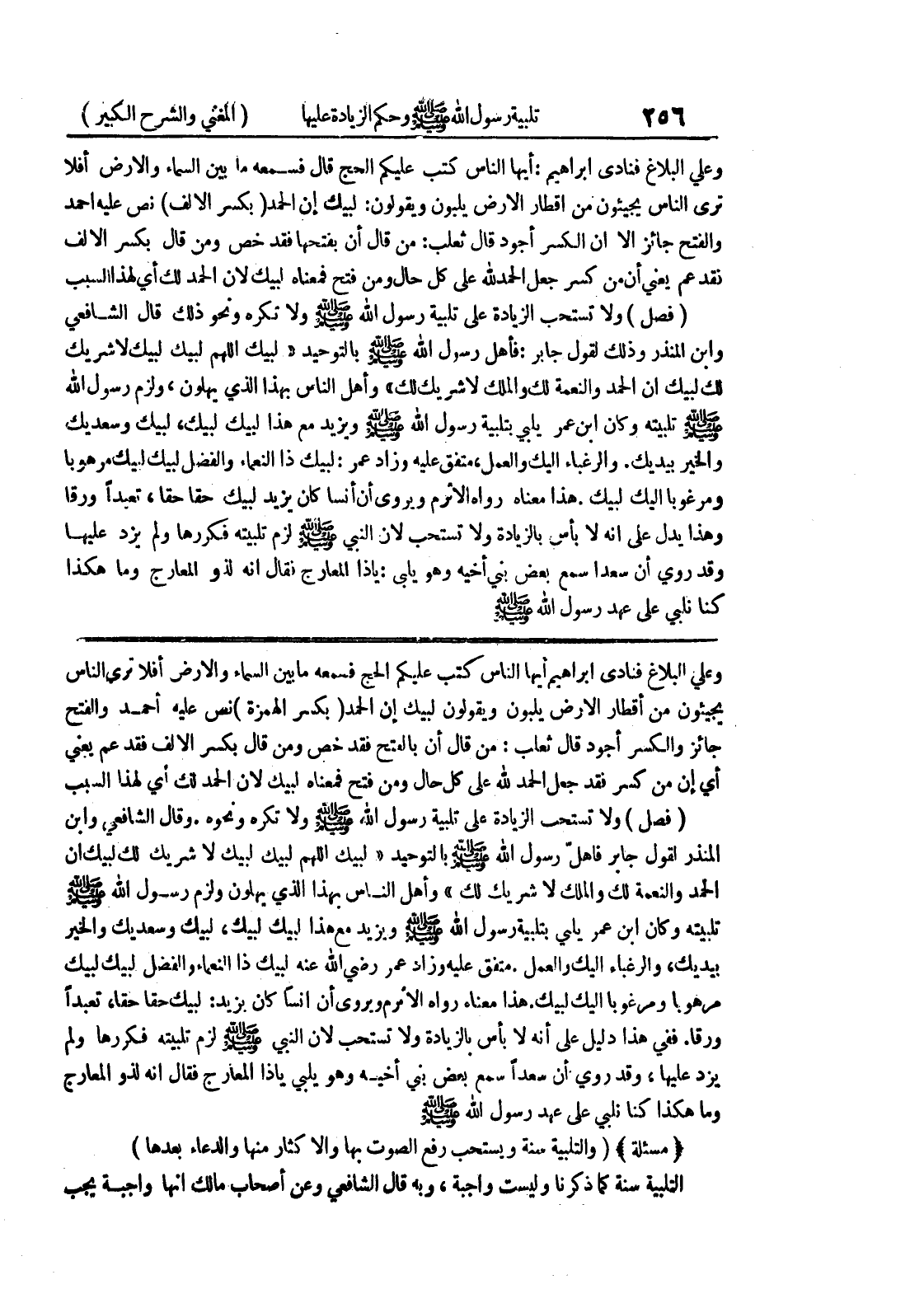 ففي هذا دليل على أنه لا بأس بالزيادة ولا تستحب لأن النبي صلى الله عليه وسلم لزم تلبيته فكررها ولم يزد عليها: وقد روي أن سعداً سمع بعض بني أخيه وهو يلبي يا ذا المعارج فقال إنه لذو المعارج وما هكذا كنا نلبي على عهد رسول الله صلى الله عليه وسلم (مسألة) (والتلبية سنة ويستحب رفع الصوت بها والإكثار منها والدعاء بعدها) التلبية سنة كما ذكرنا وليست واجبة، وبه قال الشافعي وعن أصحاب مالك أنها واجبة يجب