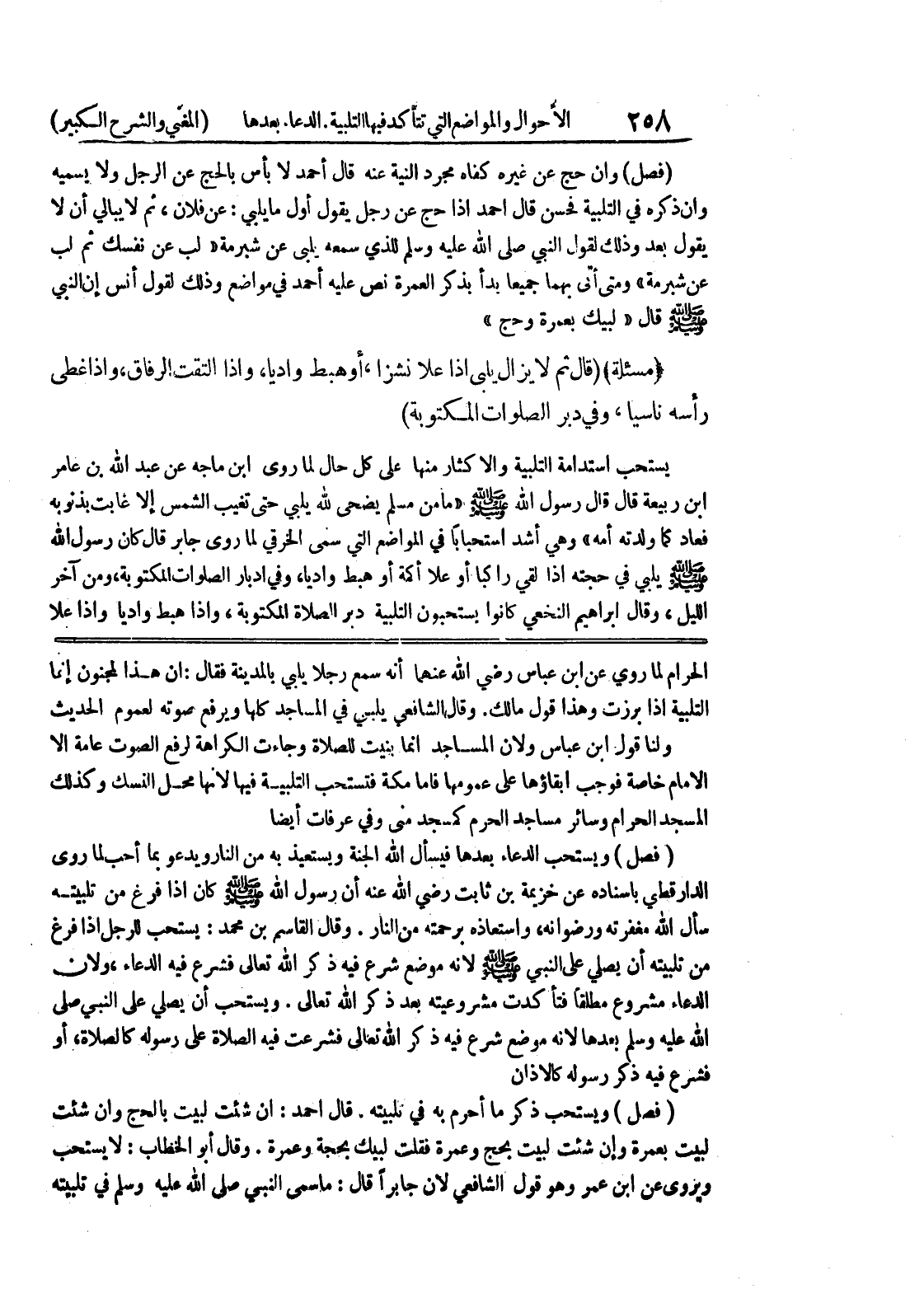 وقال الشافعي يلبي في المساجد كلها ويرفع صوته لعموم الحديث ولنا قول ابن عباس ولأن المساجد إنما بنيت للصلاة وجاءت الكراهة لرفع الصوت عامة إلا الإمام خاصة فوجب إبقاؤها على عمومها فأما مكة فتستحب التلبية فيها لأنها محل النسك وكذلك المسجد الحرام وسائر مساجد الحرم كمسجد منى وفي عرفات أيضاً (فصل) ويتسحب الدعاء بعدها فيسأل الله الجنة ويستعيذ به من النار ويدعو بما أحب لما روى الدارقطني بإسناده عن خزيمة بن ثابت رضي الله عنه أن رسول الله صلى الله عليه وسلم كان إذا فرغ من تلبيته سأل الله مغفرته ورضوانه، واستعاذه برحمته من النار.