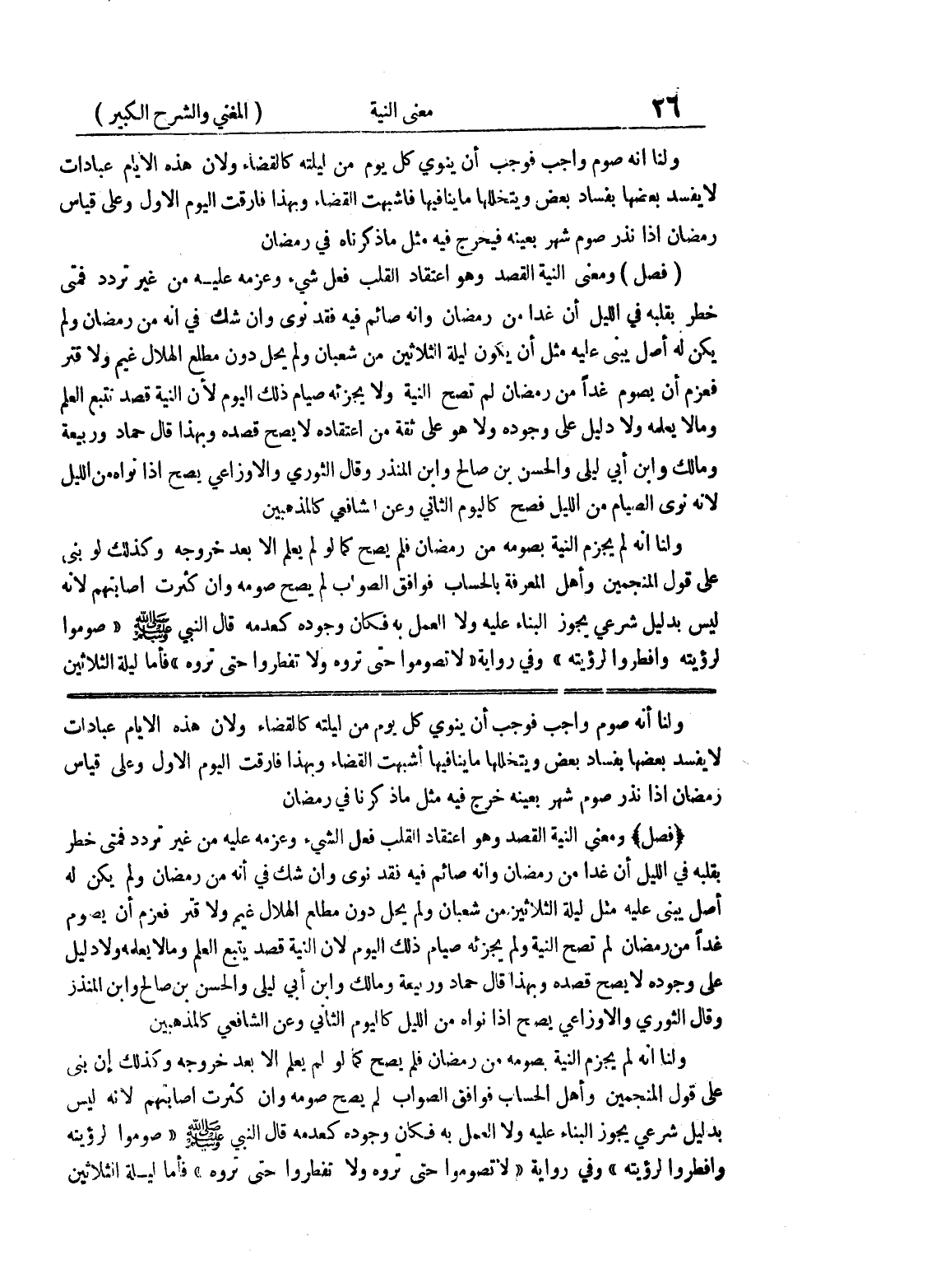 ولنا أنه صوم واجب فوجب أن ينوي كل يوم من ليلته كالقضاء ولأن هذه الأيام عبادات لا يفسد بعضها بفساد بعض ويتخللها ما ينافيها أشبهت القضاء وبهذا فارقت اليوم الأول وعلى قياس رمضان إذا نذر صوم شهر بعينه خرج فيه مثل ما ذكرنا في رمضان (فصل) ومعنى النية القصد وهو اعتقاد القلب فعل شئ وعزمه عليه من غير تردد فمتى خطر بقلبه في الليل أن غدا من رمضان وأنه صائم فيه فقد نوى وإن شك في أنه من رمضان ولم يكن له أصل يبني عليه مثل ليلة الثلاثين من شعبان ولم يحل دون مطلع الهلال غيم ولا قتر فعزم أن يصوم غداً من رمضان لم تصح النية ولم يجزئه صيام ذلك اليوم لأن النية قصد يتبع العلم وما لا يعلمه ولا دليل على وجوده لا يصح قصده وبهذا قال حماد وربيعة ومالك وابن أبي ليلى والحسن بن صالح وابن المنذر