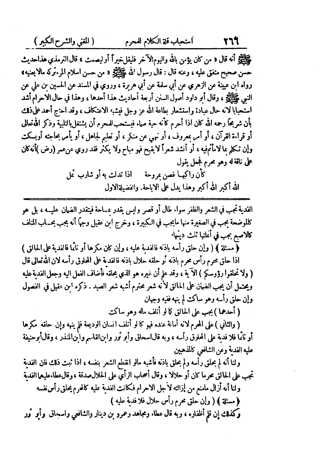 الفدية تجب في الشعر والظفر سواء طال أو قصر وليس يقدر بمساحة فيتقدر الضمان عليه، بل هو كالموضحة يجب في الصغيرة منها ما يجب في الكبيرة، وخرج ابن عقيل وجهاً أنه يجب بحساب المتلف كالاصبع يجب في أنملتها ثلث ديتها (مسألة) (وإن حلق رأسه بأذنه فالفدية عليه، وإن كان مكرها أو نائما فالفدية على الحالق)