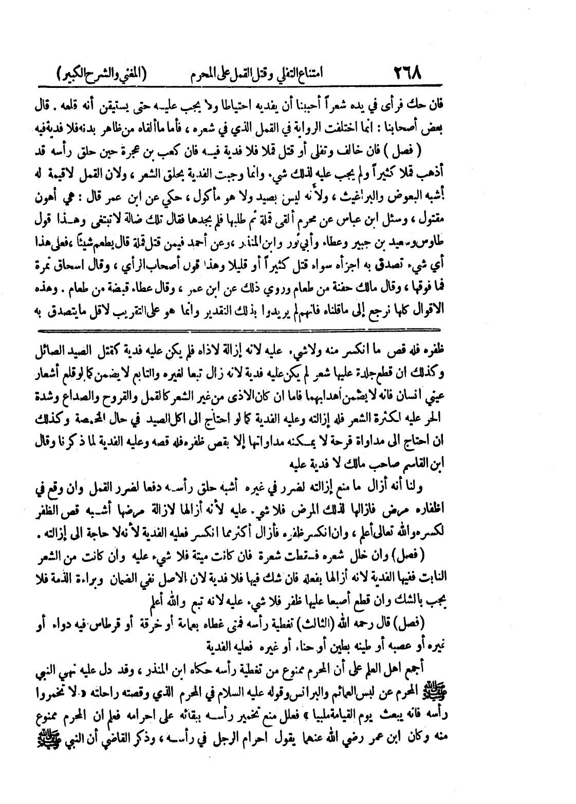 (فصل) وإن خلل شعره فسقطت شعرة فإن كانت ميتة فلا شئ عليه وإن كانت من الشعر النابت ففيها الفدية لان أزالها بفعله فإن شك فيها فلا فدية لأن الأصل نفي الضمان وبراءة الذمة فلا يجب بالشك وان قطع اصبعاً عليها ظفر فلا شئ عليه لأنه تبع والله أعلم