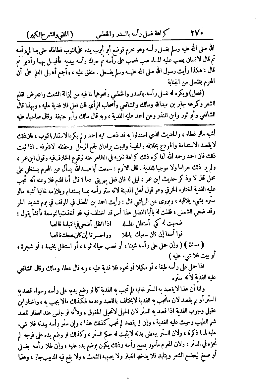 إذا ثبت ذلك فإن أحمد رحمه الله إنما كره ذلك كراهة تنزيه في الظاهر عنه لوقوع الخلاف فيه وقول ابن عمر، ولم ير ذلك حراماً ولا موجباً للفدية، قال الأثرم: سمعت أبا عبد الله يسأل عن المحرم يستظل على محمل قال لا وذكر حديث ابن عمر، قيل له فإن فعل يهريق دماً؟ قال أما الدم فلا وعنه أنه تجب عليه الفدية اختاره الخرقي وهو وقل أهل المدينة لأنه ستر رأسه بما يستدام ويلازمه غالباً أشبه مالو ستره بشئ يلاقيه، ويروى عن الرياشي قال: رأيت أحمد بن المعذل في الموقف في يوم شديد الحر وقد ضحى للشمس، فقلت له يا أبا الفضل هذا أمر قد اختلف فيه فلو أخذت بالتوسعة فأنشأ يقول: ضحيت له كي استظل بظله * إذا الظل أضحى في القيامة قالصا فوا أسفا إن كان سعيك باطلاً * وواحسرتا إن كان حجك ناقصا (مسألة) (وإن حمل على رأسه شيئاً، أو نصب حياله ثوباً، أو ستظل بخيمة، أو شجرة، أو بيت فلا شئ عليه) إذا حمل على رأسه طبقاً، أو مكيلاً أو نحوه فلا فديه عليه، وبه قال عطاء ومالك وقال الشافعي عليه الفدية لأنه ستره ولنا أن هذ لا يقصد به الستر غالباً فلم تجب به الفدية كما لو وضع يديه على رأسه وسواء قصد به الستر أو لم يقصد لأن ما تجب به الفدية لا يختلف بالقصد وعدمه فكذلك مالا يجب به، واختار ابن