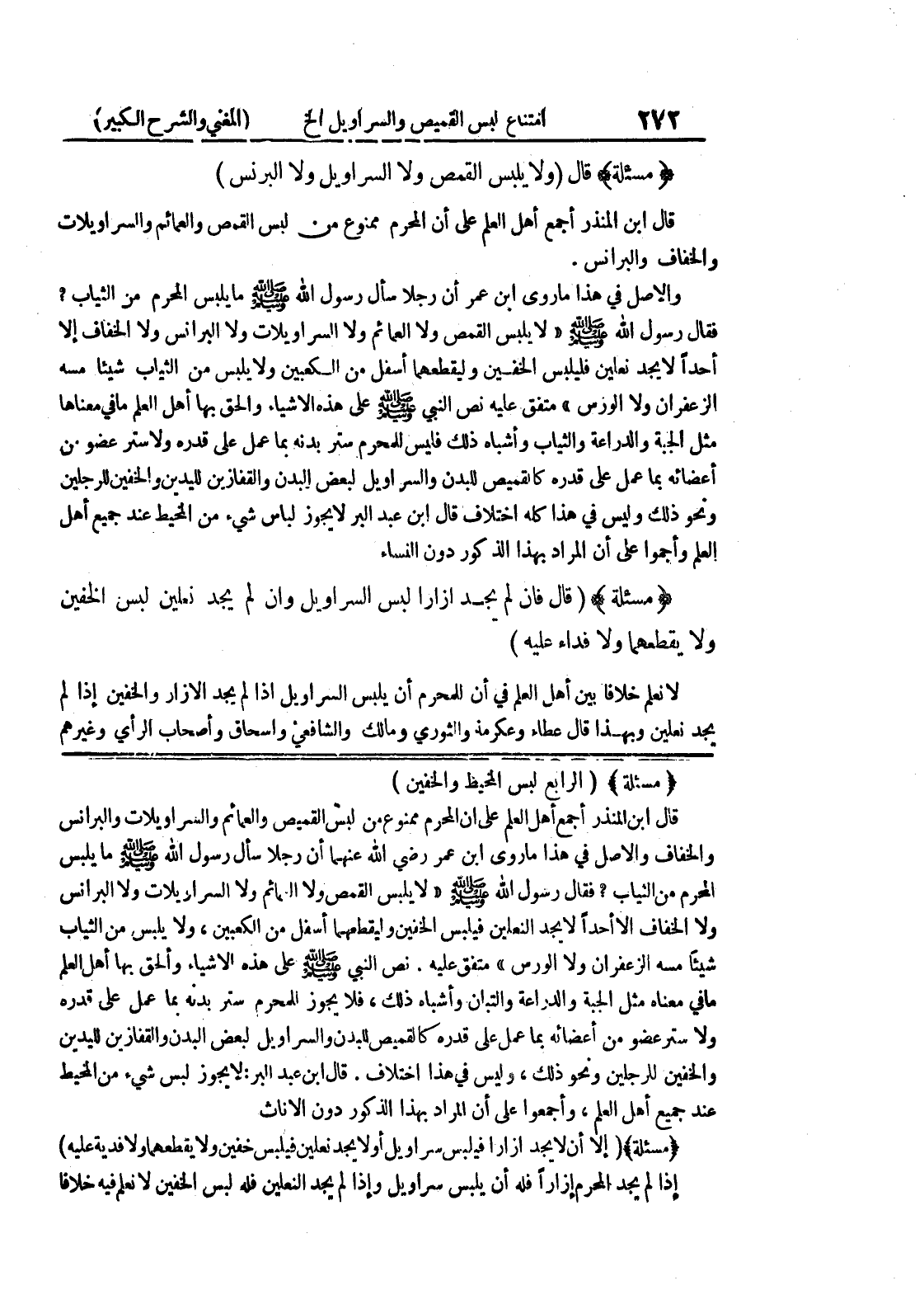 نص النبي صلى الله عليه وسلم على هذه الأشياء وألحق بها أهل العلم ما في معناه مثل الجبة والدراعة والتبان وأشباه ذلك، فلا يجوز للمحرم ستر بدنه بما عمل على قدره ولا ستر عضو من أعضائه بما عمل على قدره كالقميص للبدن والسراويل لبعض البدن والقفازين لليدين والخفين للرجلين ونحو ذلك، وليس في هذا اختلاف، قال ابن عبد البر: لا يجوز لبس شئ من المخيط عند جميع أهل العلم، وأجمعوا على ان المراد بهذا الذكور دون الاناث (مسألة) (إلا أن لا يجد إزارا فيلبس سراويل أو لا يجد نعلين فيلبس خفين ولا يقطعهما ولا فدية عليه) إذا لم يجد المحرم إزاراً فله أن يلبس سراويل وإذا لم يجد النعلين فله لبس الخفين لا نعلم فيه خلافا