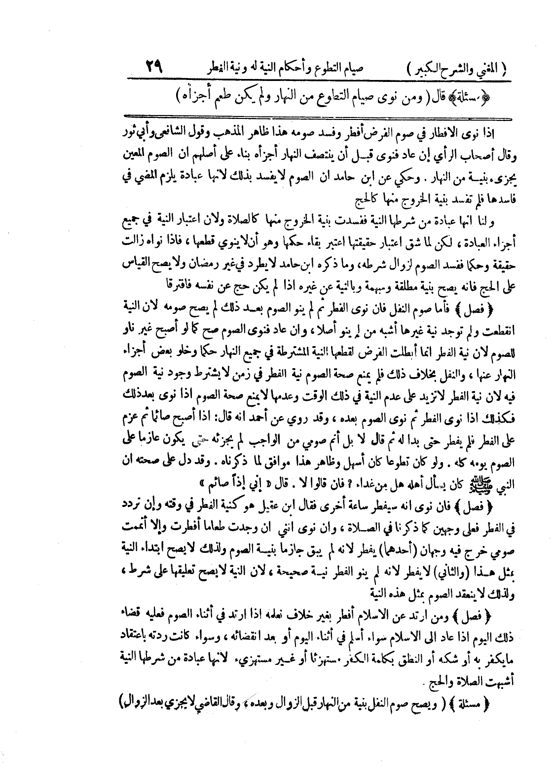 إذا نوى الإفطار في صوم الفرض أفطر وفسد صومه هذا ظاهر المذهب وقول الشافعي وأبي ثور وقال أصحاب الرأي إن عاد فنوى قبل أن ينتصف النهار أجزأه بناء على أصلهم أن الصوم المعين يجزئ بنية من النهار، وحكي عن ابن حامد أن الصوم لا يفسد بذلك لأنها عبادة يلزم المضي في فاسدها فلم تفسد بنية الخروج منها كالحج ولنا أنها عبادة من شرطها النية ففسدت بنية الخروج منها كالصلاة ولأن اعتبار النية في جيمع أجزاء العبادة، لكن لما شق اعتبار حقيقتها اعتبر بقاء حكمها وهو أن لا ينوي قطعها، فإذا نواه زالت حقيقة وحكما ففسد الصوم لزوال شرطه، وما ذكره ابن حامد لا يطرد في غير رمضان ولا يصح القياس على الحج فإنه يصح بنية مطلقة وسبهمة وبالنية عن غيره إذا لم يكن حج عن نفسه فافترقا