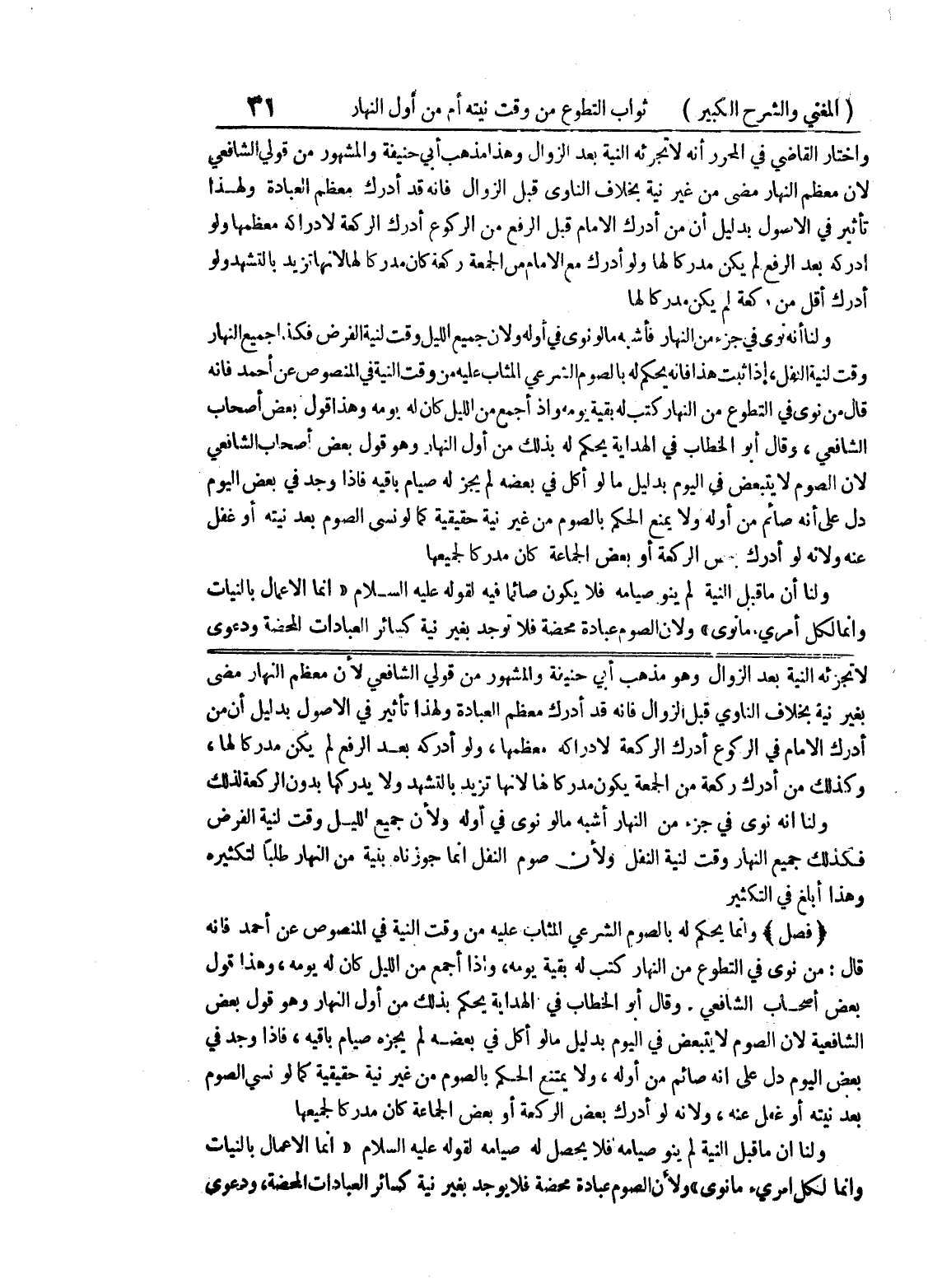 لا تجزئه النية بعد الزوال وهو مذهب أبي حنيفة والمشهور من قولي الشافعي لأن معظم النهار مضى بغير نية بخلاف الناوي قبل الزوال فإنه قد أدرك معظم العبادة ولهذا تأثير في الأصول بدليل أن من أدرك الإمام في الركوع أدرك الركعة لإدراكه معظمها، ولو أدركه بعد الرفع لم يكن مدركاً لها، وكذلك من أدرك ركعة من الجمعة يكون مدركاً لها لأنها لا تزيد بالتشهد شيئا ولا يدركها بدون الركعة لذلك ولنا أنه نوى في جزء من النهار أشبه مالو نوى في أوله ولأن جميع الليل وقت النية الفرض فكذلك جميع النهار وقت لنية النفل ولأن صوم النفل إنما جوزناه بنية من النهار طلباً لتكثيره وهذا أبلغ في التكثير (فصل) وإنما يحكم له بالصوم الشرعي المثاب عليه من وقت النية في المنصوص عن أحمد فإنه قال: من نوى في التطوع من النهار كتب له بقية يومه، وأذا أجمع من الليل كان له يومه، وهذا قول بعض أصحاب الشافعي، وقال أبو الخطاب في الهداية يحكم بذلك من أول النهار وهو قول بعض