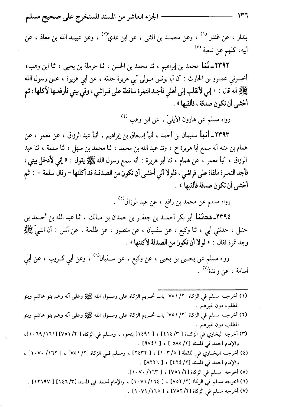 2393 - أنبأ سُلَيْمَانُ بْنُ أَحْمَدَ أنبا إِسْحَاقُ بْنُ إِبْرَاهِيمَ أَنْبَأَ عَبْدُ الرَّزَّاقِ عَنْ مَعْمَرٍ عَنْ هَمَّامِ بْنِ مُنَبِّهٍ أَنَّهُ سَمِعَ أَبَا هُرَيْرَةَ ح وثنا عَبْدُ اللَّهِ بْنُ مُحَمَّدِ ثَنَا مُحَمَّدٌ بْنِ سَهْلٍ ثَنَا سَلَمَةُ ثَنَا عَبْدُ الرَّزَّاقِ أَنْبَأَ مَعْمَرٌ عَنْ هَمَّامِ ثَنَا أَبُو هُرَيْرَةَ أَنَّهُ سَمِعَ رَسُولُ اللَّهِ صَلَّى اللَّهُ عَلَيْهِ وَسَلَّمَ يَقُولُ إِنِّي لَأَدْخُلُ بَيْتِي فَأَجِدُ التَّمْرَةَ مُلْقَاةً عَلَى فِرَاشِي فَلَوْلا أَنِّي أَخْشَى أَنْ تَكُونَ مِنَ الصَّدَقَةِ قَدْ أَكَلْتُهَا وَقَالَ سَلَمَةُ ثُمَّ أَخْشَى أَنْ تَكُونَ صَدَقَةً فَأُلْقِيهَا