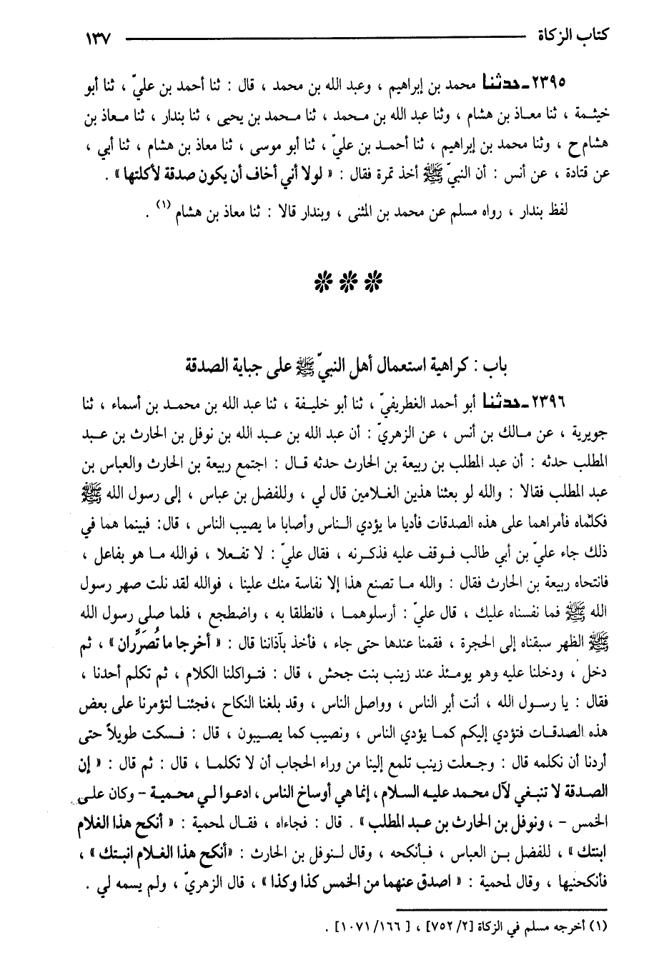 2396 - حَدَّثَنَا أَبُو أَحْمَدَ الْغِطْرِيفِيُّ ثَنَا أَبُو خَلِيفَةَ ثَنَا عَبْدُ اللَّهِ بْنُ مُحَمَّدِ بْنِ أَسْمَاءَ ثَنَا جُوَيْرِيَةُ عَنْ مَالِكِ بْنِ أَنَسٍ عَنْ الزُّهْرِيِّ أَنَّ عَبْدَ اللَّهِ بْنَ عَبْدِ اللَّهِ بْنِ نَوْفَلِ بْنِ الْحَارِثِ بْنِ عَبْدِ الْمُطَّلِبِ حَدَّثَهُ أَنَّ عَبْدَ الْمُطَّلِبِ بْنَ رَبِيعَةَ بْنِ الْحَارِثِ حَدَّثَهُ قَالَ اجْتَمَعَ رَبِيعَةُ بْنُ الْحَارِثِ وَالْعَبَّاسُ بْنُ عَبْدِ الْمُطَّلِبِ فَقَالا وَاللَّهِ لَوْ بَعَثْنَا هَذَيْنِ الْغُلامَيْنِ قَالَ لِي وَلِلْفَضْلِ بْنِ عَبَّاسٍ إِلَى رَسُولِ اللَّهِ صَلَّى اللَّهُ عَلَيْهِ وَسَلَّمَ فَكَلَّمَاهُ فَأَمَّرَاهُمَا عَلَى هَذِهِ الصَّدَقَاتِ فَأَدَّيَا مَا يُؤَدِّي النَّاسُ وَأَصَابَا مَا يُصِيبُ النَّاسُ قَالَ فَبَيْنَمَا هُمَا فِي ذَلِكَ جَاءَ عَلِيُّ بْنُ أَبِي طَالِبٍ فَوَقَفَ عَلَيْهِ فَذَكرته فَقَالَ عَلِيٌّ لَا تَفْعَلا فَوَاللَّهِ مَا هُوَ بِفَاعِلٍ فَانْتَحَاهُ رَبِيعَةُ بنالحارث فَقَالَ وَاللَّهِ مَا تَصْنَعُ هَذَا إِلَّا نَفَاسَةً مِنْكَ عَلَيْنَا فَوَاللَّهِ لَقَدْ نِلْتَ صِهْرَ رَسُولِ اللَّهِ صَلَّى اللَّهُ عَلَيْهِ وَسَلَّمَ فَمَا نَفِسْنَاهُ عَلَيْكَ قَالَ عَلِيٌّ أَرْسِلُوهُمَا فَانْطَلَقَا بِهِ وَاضْطَجَعَ فَلَمَّا صَلَّى رَسُولُ اللَّهِ صَلَّى اللَّهُ عَلَيْهِ وَسَلَّمَ الظُّهْرَ سَبَقْنَاهُ إِلَى الْحُجْرَةِ فَقُمْنَا عِنْدَهَا حَتَّى جَاءَ فَأَخَذَ بِآذَانِنَا قَالَ أَخْرِجَا مَا تُصَرِّرَانِ ثُمَّ دَخَلَ وَدَخَلْنَا عَلَيْهِ وَهُوَ يَوْمَئِذٍ عِنْدَ زَيْنَبَ بِنْتِ جَحْشٍ قَالَ فَتَوَاكَلْنَا الْكَلامَ ثُمَّ تَكَلَّمَ أَحَدُنَا فَقَالَ يَا رَسُولَ اللَّهِ أَنْتَ أَبَرُّ النَّاسِ وَوَاصِلُ النَّاسِ وَقَدْ بَلَغْنَا النِّكَاحَ فَجِئْنَا لِتُؤَمِّرَنَا على بعض هَذِه الصَّدقَات فتؤدي إِلَيْكُمْ كَمَا يُؤَدِّي النَّاسُ وَنُصِيبُ كَمَا يُصِيبُونَ قَالَ فَسَكَتَ طَوِيلًا حَتَّى أَرَدْنَا أَنْ نُكَلِّمَهُ قَالَ وَجَعَلَتْ زَيْنَبُ تُلْمِعُ إِلَيْنَا مِنْ وَرَاء الْحجاب أَن لَا تكلما قَالَ ثُمَّ قَالَ إِنَّ الصَّدَقَةَ لَا تَنْبَغِي لِآلِ مُحَمَّدٍ صَلَّى اللَّهُ عَلَيْهِ وَسَلَّمَ إِنَّمَا هِيَ أَوْسَاخُ النَّاسِ ادْعُوَا لِي مَحْمُيَةَ وَكَانَ عَلَى الْخُمُسِ وَنَوْفَلَ بْنَ الْحَارِثِ بْنِ عَبْدِ الْمُطَّلِبِ قَالَ فجاءاه فَقَالَ لِمَحْمِيَةَ أَنْكِحْ هَذَا الْغُلامَ ابْنَتَكَ لِلْفَضْلِ بْنِ الْعَبَّاسِ فَأَنْكَحَهُ